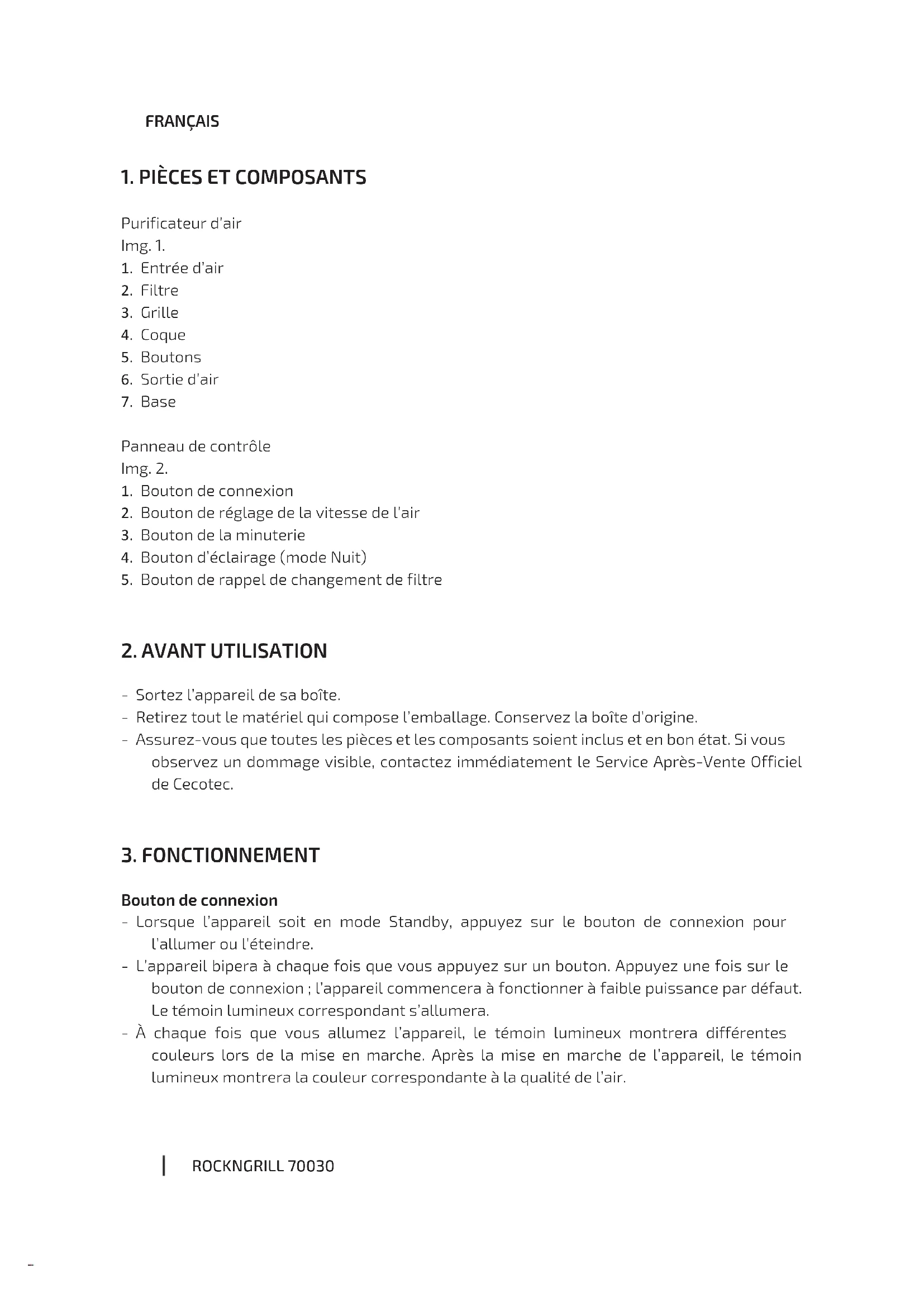 Bouton de connexion - Lorsque l’appareil soit en mode Standby, appuyez sur le bouton de connexion pour l’allumer ou l’éteindre. - L’appareil bipera à chaque fois que vous appuyez sur un bouton. Appuyez une fois sur le bouton de connexion; l’appareil commencera à fonctionner à faible puissance par défaut. Le témoin lumineux correspondant s’allumera. - À chaque fois que vous allumez l’appareil, le témoin lumineux montrera différentes couleurs lors de la mise en marche. Après la mise en marche de l’appareil, le témoin lumineux montrera la couleur correspondante à la qualité de l’air. 05658_TotalPure 1800 Style Pro Connected_IM_YV_01210317.indd 3005658_TotalPure 1800 Style Pro Connected_IM_YV_01210317.indd 30 22/3/21 13:2522/3/21 13:25ROCKNGRILL 700 31 FRANÇAIS Bouton de réglage de la vitesse de l’air Lorsque l’appareil est en fonctionnement, appuyez sur le bouton de la vitesse d’air pour la régler: Faible/Élevée/Auto. Le témoin lumineux correspondant s’allumera et, à chaque fois que vous appuyez sur le bouton de la vitesse de l’air, l’appareil bipera. Mode Auto - La vitesse de l’air changera automatiquement selon la qualité de l’air détectée; ainsi, le témoin lumineux correspondant s’allumera. - Si la qualité de l’air est mauvaise, la vitesse élevée démarrera et le témoin s’allumera en rouge. - Si la qualité de l’air est normale, la vitesse moyenne démarrera et le témoin s’allumera en jaune. - Si la qualité de l’air est bonne, la vitesse basse démarrera et le témoin s’allumera en bleu. Bouton de la minuterie Lorsque l’appareil est en fonctionnement, appuyez sur le bouton de la minuterie pour établir le temps de fonctionnement souhaité : 2 h - 4 h - 8 h - en continu. Le témoin lumineux correspondant s’allumera. L’appareil entrera en mode Standby une fois le temps écoulé. L’appareil bipera à chaque fois que vous appuyez sur le bouton de la minuterie. Bouton d’éclairage (mode Nuit) Lorsque l’appareil est en fonctionnement, appuyez sur le bouton d’éclairage pour régler la lumière à votre goût : Normale-Faible-Éteinte. L’appareil bipera à chaque fois que vous appuyez sur le bouton de l’éclairage. Bouton de rappel de changement de filtre Lorsque l'appareil détecte que le filtre est saturé après 2200 heures de fonctionnement, le témoin lumineux clignotera en rouge. Maintenez appuyé le bouton du filtre pendant 7 secondes afin que le témoin lumineux arrête de clignoter. Redémarrez l’appareil après avoir installé le nouveau filtre. Avertissement L'appareil continuera à fonctionner normalement, même si le rappel de changement de filtre est actif.