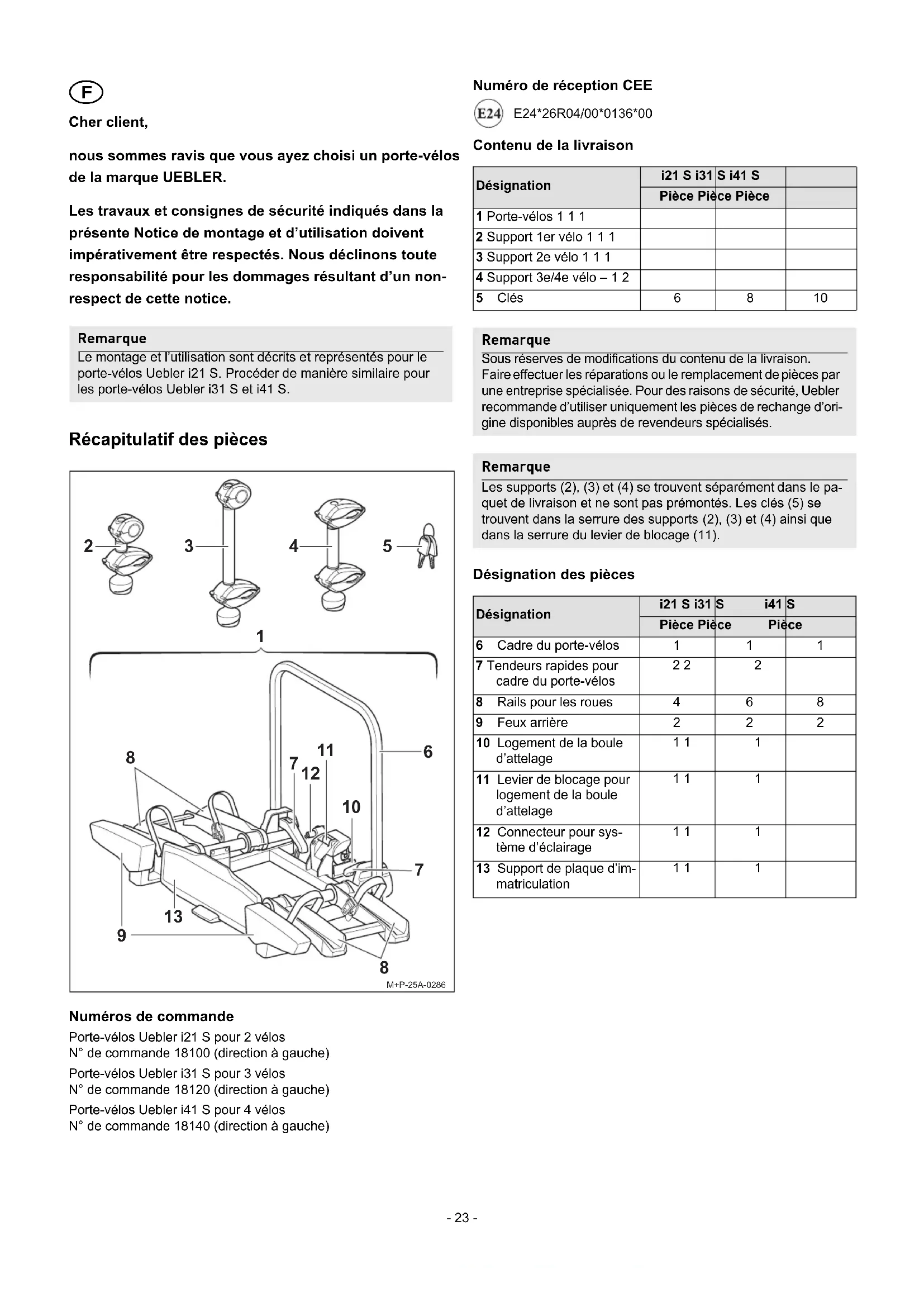Cher client, nous sommes ravis que vous ayez choisi un porte-vélos de la marque UEBLER. Les travaux et consignes de sécurité indiqués dans la présente Notice de montage et d’utilisation doivent impérativement être respectés. Nous déclinons toute responsabilité pour les dommages résultant d’un non- respect de cette notice. Récapitulatif des pièces Numéros de commande Porte-vélos Uebler i21 S pour 2 vélos N° de commande 18100 (direction à gauche) Porte-vélos Uebler i31 S pour 3 vélos N° de commande 18120 (direction à gauche) Porte-vélos Uebler i41 S pour 4 vélos N° de commande 18140 (direction à gauche) Numéro de réception CEE E24*26R04/00*0136*00 Contenu de la livraison Désignation des pièces Remarque Le montage et l’utilisation sont décrits et représentés pour le porte-vélos Uebler i21 S. Procéder de manière similaire pour les porte-vélos Uebler i31 S et i41 S.