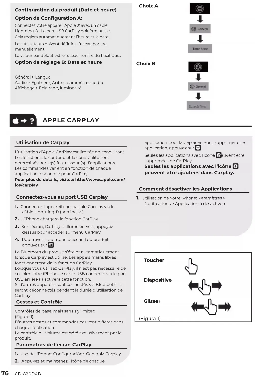 76 ICD-820DAB Choix A Choix B APPLE CARPLAY Conguration du produit (Date et heure) Option de Conguration A: Connectez votre appareil Apple ® avec un câble Lightning ® . Le port USB CarPlay doit être utilisé. Cela réglera automatiquement l’heure et la date. Les utilisateurs doivent dénir le fuseau horaire manuellement. La valeur par défaut est le fuseau horaire du Pacique.. Option de réglage B: Date et heure Général > Langue Audio > Égaliseur, Autres paramètres audio Afchage > Éclairage, luminosité Utilisation de Carplay L’utilisation d’Apple CarPlay est limitée en conduisant. Les fonctions, le contenu et la convivialité sont déterminés par le(s) fournisseur (s) d’applications. Les commandes varient en fonction de chaque application disponible pour CarPlay. Pour plus de détails, visitez: http://www.apple.com/ ios/carplay Connectez-vous au port USB Carplay