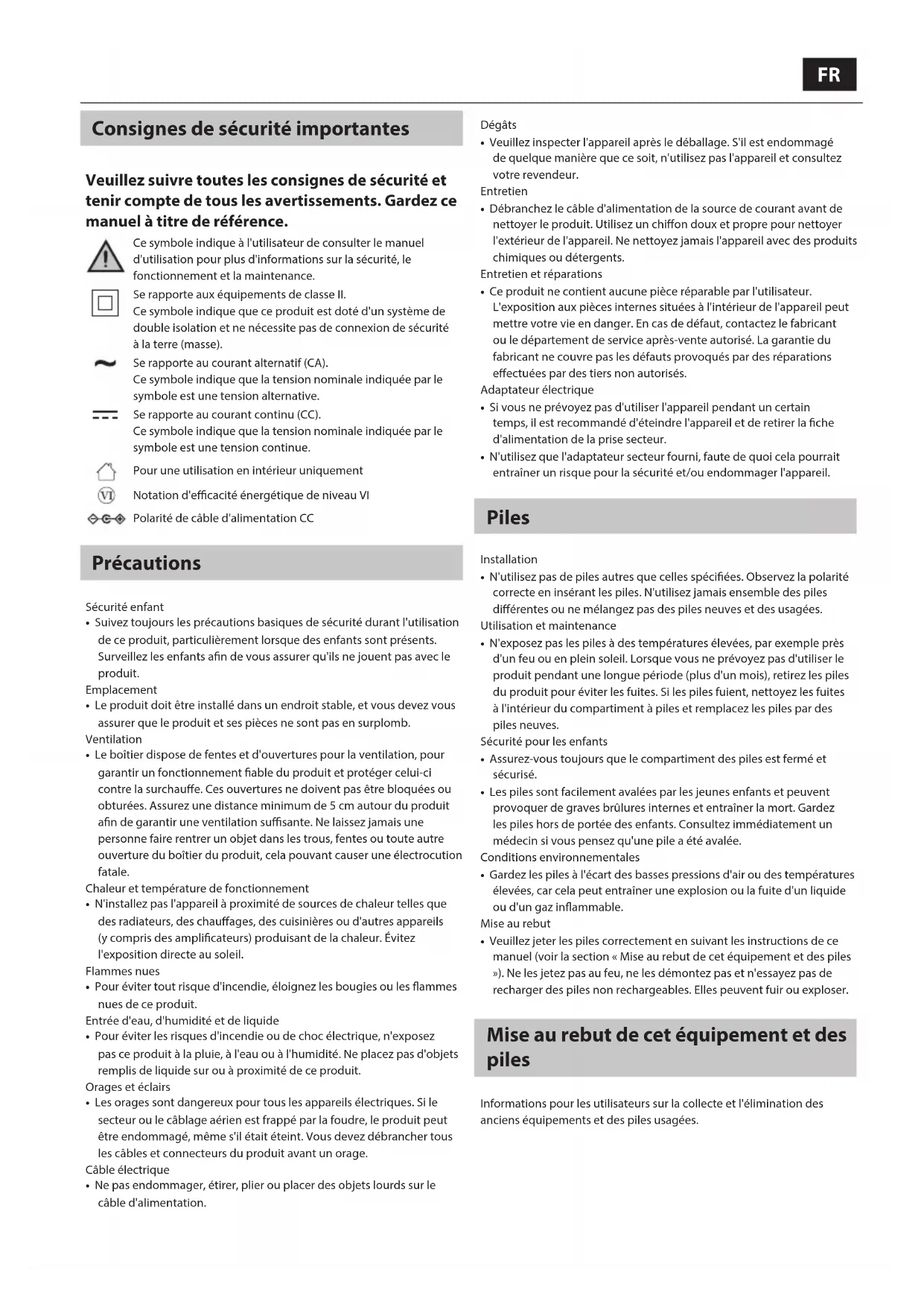 Ce symbole indique à l'utilisateur de consulter le manuel d'utilisation pour plus d'informations sur la sécurité, le fonctionnement et la maintenance. Se rapporte aux équipements de classeII. Ce symbole indique que ce produit est doté d'un système de double isolation et ne nécessite pas de connexion de sécurité àla terre (masse). Se rapporte au courant alternatif (CA). Ce symbole indique que la tension nominale indiquée par le symbole est une tension alternative. Se rapporte au courant continu (CC). Ce symbole indique que la tension nominale indiquée par le symbole est une tension continue. Pour une utilisation en intérieur uniquement Notation d'ecacité énergétique de niveauVI Polarité de câble d'alimentation CC Précautions Sécurité enfant