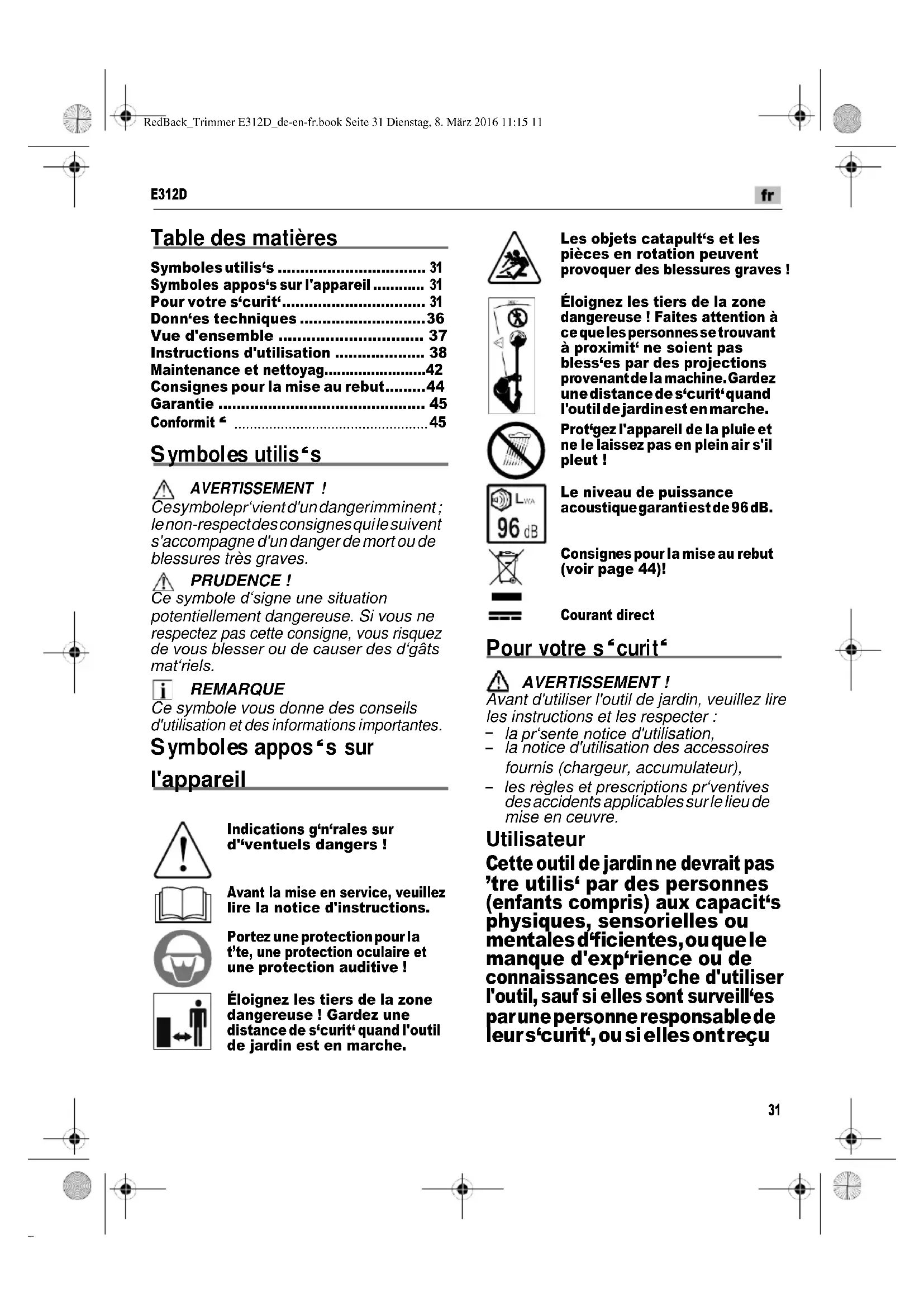 Les objets catapult‘s et les pièces en rotation peuvent provoquer des blessures graves ! Éloignez les tiers de la zone dangereuse ! Faites attention à ce que les personnes se trouvant à proximit‘ ne soient pas bless‘es par des projections provenant de la machine. Gardez une distance de s‘curit‘ quand l'outil de jardin est en marche. Prot‘gez l'appareil de la pluie et ne le laissez pas en plein air s'il pleut ! Le niveau de puissance acoustique garanti est de 96 dB.