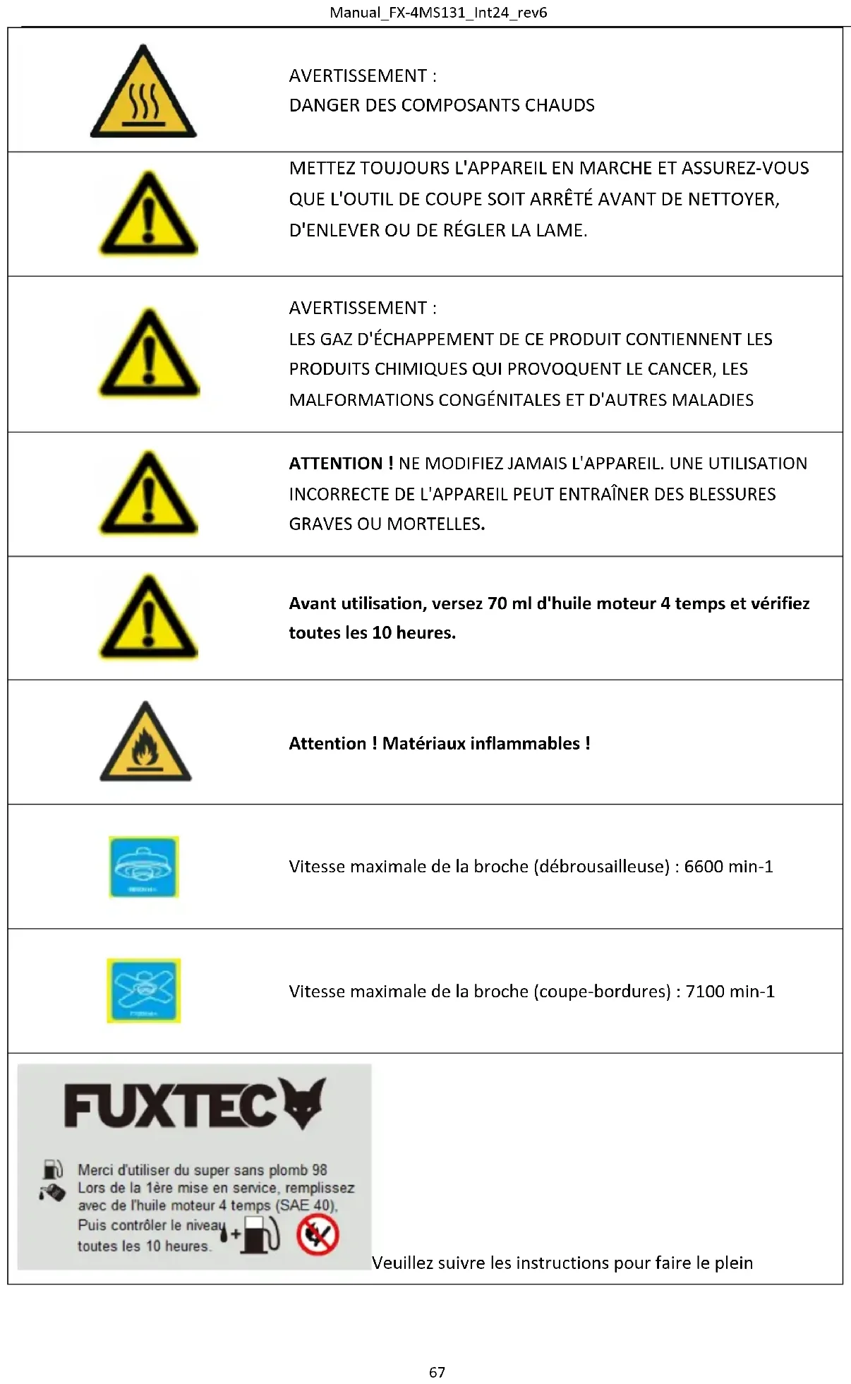 Vitesse maximale de la broche (coupe-bordures) : 7100 min-1 Veuillez suivre les instructions pour faire le pleinManual_FX-4MS131_Int24_rev6