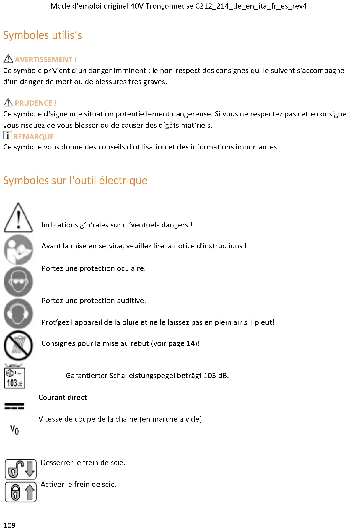 Avertissements de s‘curit‘ g‘n‘raux pour l'outil AVERTISSEMENT ! Lire tous les avertissements de s‘curit‘ et toutes les instructions. Ne pas suivre les avertissements et instructions peut donner lieu à un choc ‘lectrique, un incendie et/ou une blessure s‘rieuse. Conserver tous les avertissements et toutes les instructions pour pouvoir s'y reporter ult‘rieurement.Mode d'emploi original 40V Tronçonneuse C212_214_de_en_ita_fr_es_rev4