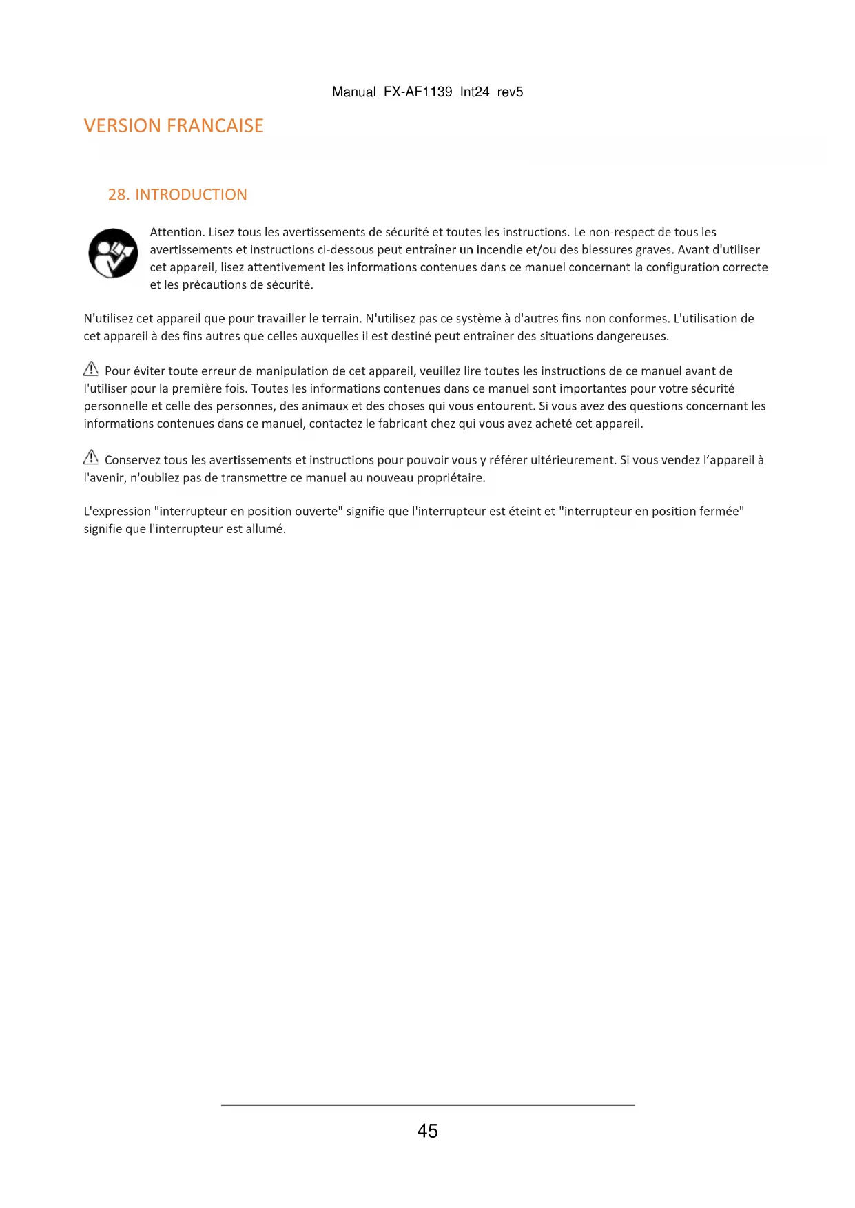Attention. Lisez tous les avertissements de sécurité et toutes les instructions. Le non-respect de tous les avertissements et instructions ci-dessous peut entraîner un incendie et/ou des blessures graves. Avant d'utiliser cet appareil, lisez attentivement les informations contenues dans ce manuel concernant la configuration correcte et les précautions de sécurité. N'utilisez cet appareil que pour travailler le terrain. N'utilisez pas ce système à d'autres fins non conformes. L'utilisation de cet appareil à des fins autres que celles auxquelles il est destiné peut entraîner des situations dangereuses. Pour éviter toute erreur de manipulation de cet appareil, veuillez lire toutes les instructions de ce manuel avant de l'utiliser pour la première fois. Toutes les informations contenues dans ce manuel sont importantes pour votre sécurité personnelle et celle des personnes, des animaux et des choses qui vous entourent. Si vous avez des questions concernant les informations contenues dans ce manuel, contactez le fabricant chez qui vous avez acheté cet appareil. Conservez tous les avertissements et instructions pour pouvoir vous y référer ultérieurement. Si vous vendez l’appareil à l'avenir, n'oubliez pas de transmettre ce manuel au nouveau propriétaire. L'expression "interrupteur en position ouverte" signifie que l'interrupteur est éteint et "interrupteur en position fermée" signifie que l'interrupteur est allumé.Manual_FX-AF1139_Int24_rev5