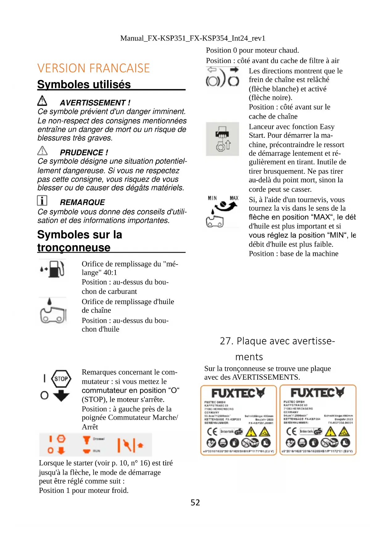 ments Sur la tronçonneuse se trouve une plaque avec des AVERTISSEMENTS.Manual_FX-KSP351_FX-KSP354_Int24_rev1