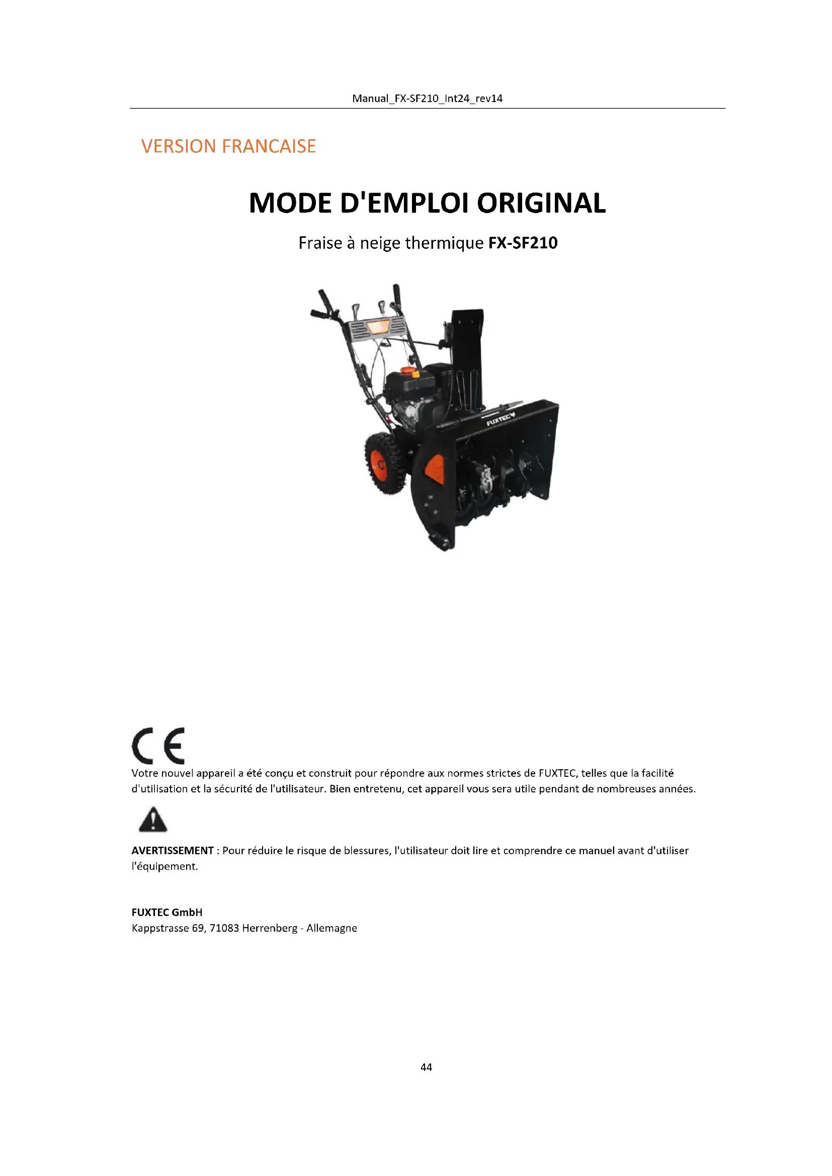 FUXTEC GmbH Responsible for documentation: Kappstraße 69, 71083 Herrenberg-Gültstein, Allemagne Directives communautaires co-appliquées : Additional used EC Directives: : - Directive 2012/46/UE relative à la lutte contre les émissions de gaz et de particules polluants atmosphériques provenant des moteurs à combustion interne pour engins mobiles - Directive 2012/46/EU against the emission of gaseous and particulate pollutants from internal combustion engines to be installed in non- road mobile machinery - Directive CEM 2014/30/UE - Directive CEM 2014/30/UE - Directive 2000/14/CE sur le bruit pour les équipements destinés à être utilisés à l'extérieur des bâtiments. - Outdoor- Noise- Directive 2000/14/EC - Directive ROHS 2011/65/EU /Directive ROHS 2011/65/EU Puissance acoustique mesurée 102,4 dB(A)Manual_FX-SF210_Int24_rev14
