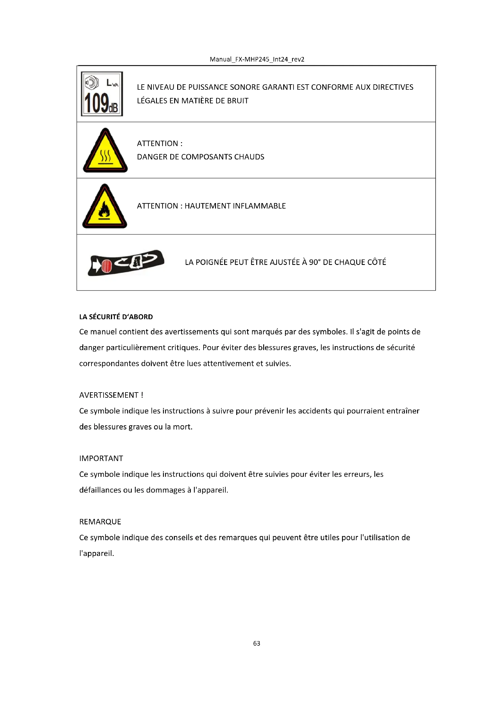 suffisamment de pauses peut entraîner le syndrome de vibration mains-bras (syndrome du doigt blanc / phénomène de Raynaud). Une estimation du degré de sollicitation par rapport au travail ou à l'utilisation de l'appareil doit être faite et des pauses appropriées doivent être prises. De cette manière, le degré de stress peut être considérablement réduit pendant toute la durée du travail. Minimisez votre risque d'exposition aux vibrations. Entretenez cet appareil conformément aux instructions du manuel d'utilisation. Évitez d'utiliser l'appareil à des températures inférieures ou égales à 10°C. Établissez un plan de travail pour limiter l'exposition aux vibrations. Un certain nombre de nuisances sonores dues à cet appareil ne peuvent être évitées. Reportez les travaux à forte intensité sonore à des moments approuvés et définis. Si nécessaire, respectez les périodes de repos et limitez la durée du travail au minimum absolu. Pour votre protection personnelle et celle des personnes se trouvant à proximité, portez et faites porter une protection auditive adaptée. Les réglementations nationales peuvent restreindre l'utilisation de cet appareil.Manual_FX-MHP245_Int24_rev2