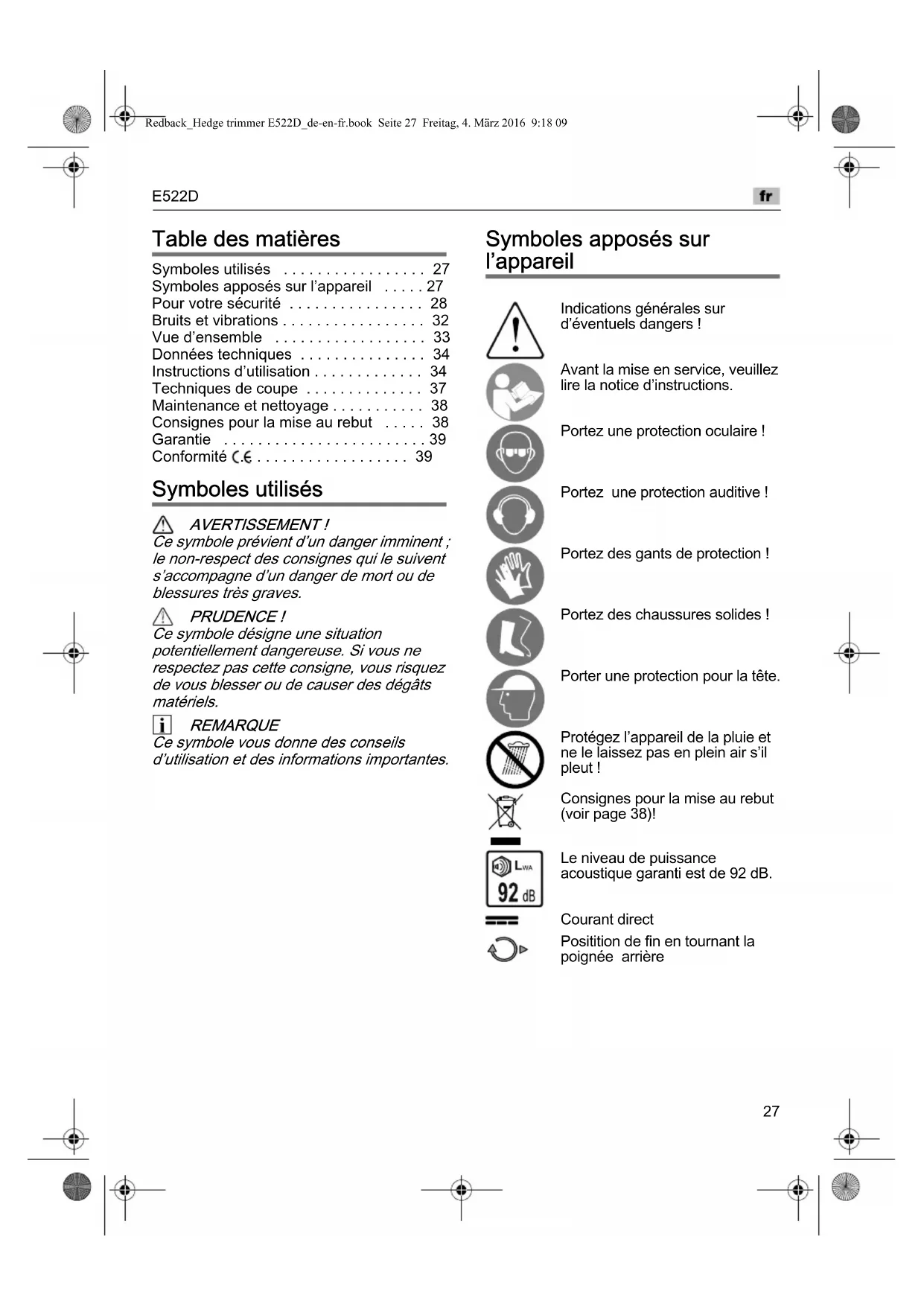 - Conformit‘ Symboles utilis‘s AVERTISSEMENT ! Ce symbole pr‘vient dun danger imminent ; le non-respect des consignes qui le suivent saccompagne dun danger de mort ou de blessures très graves. PRUDENCE ! Ce symbole d‘signe une situation potentiellement dangereuse. Si vous ne respectez pas cette consigne, vous risquez de vous blesser ou de causer des d‘gâts mat‘riels. REMARQUE Ce symbole vous donne des conseils dutilisation et des informations importantes. Symboles appos‘s sur lappareil Indications g‘n‘rales sur d‘ventuels dangers ! Avant la mise en service, veuillez lire la notice dinstructions. Portez une protection oculaire ! Portez une protection auditive ! Portez des gants de protection ! Portez des chaussures solides ! Porter une protection pour la t’te. Prot‘gez lappareil de la pluie et ne le laissez pas en plein air sil pleut ! Consignes pour la mise au rebut (voir page 38)! Le niveau de puissance acoustique garanti est de 92 dB. Courant direct Positition de fin en tournant la poign‘e arrière Redback_Hedge trimmer E522D_de-en-fr.book Seite 27 Freitag, 4. März 2016 9:18 09E522D p. 39