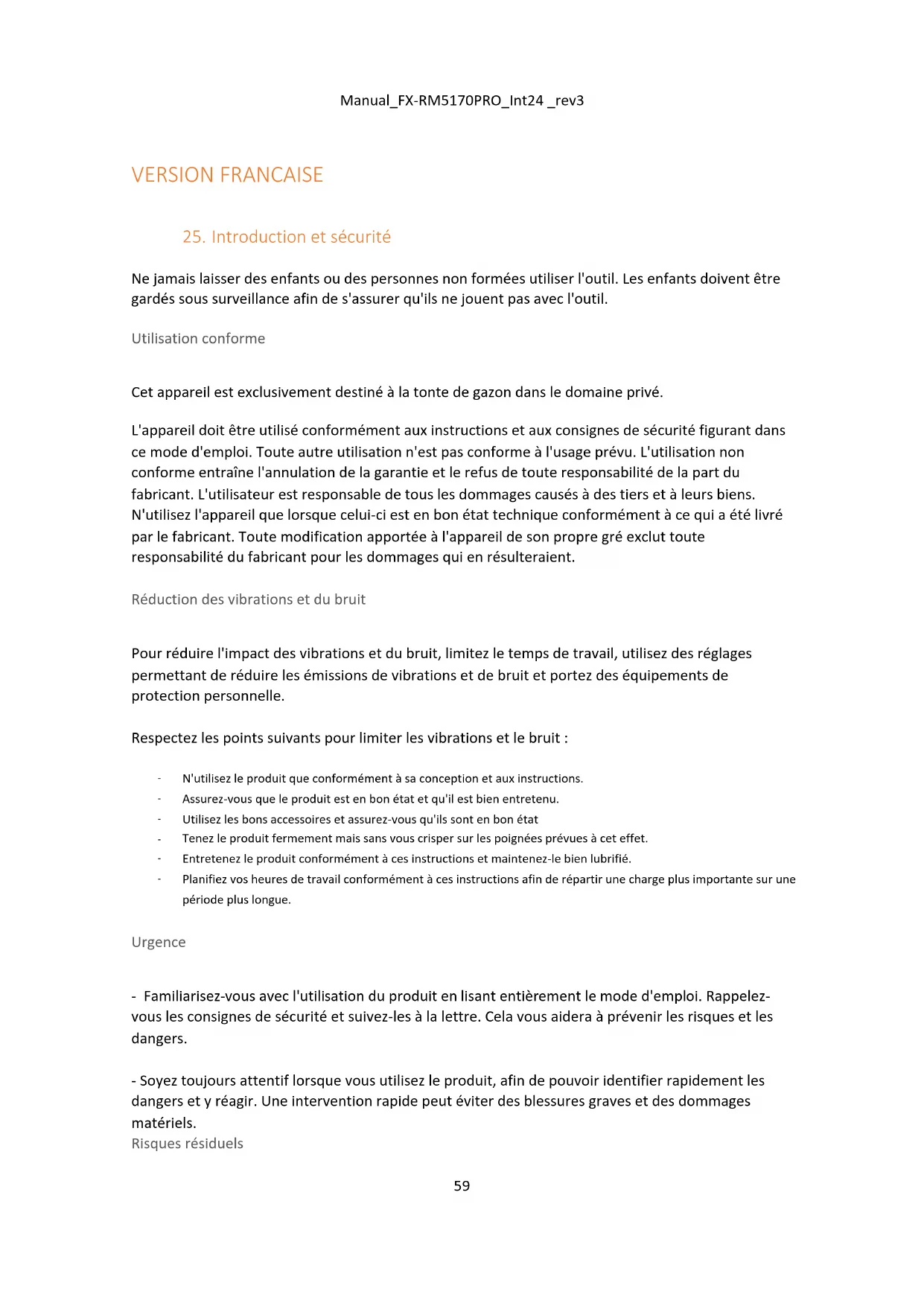 Planifiez vos heures de travail conformément à ces instructions afin de répartir une charge plus importante sur une période plus longue. Urgence - Familiarisez-vous avec l'utilisation du produit en lisant entièrement le mode d'emploi. Rappelez- vous les consignes de sécurité et suivez-les à la lettre. Cela vous aidera à prévenir les risques et les dangers. - Soyez toujours attentif lorsque vous utilisez le produit, afin de pouvoir identifier rapidement les dangers et y réagir. Une intervention rapide peut éviter des blessures graves et des dommages matériels. Risques résiduelsManual_FX-RM5170PRO_Int24 _rev3