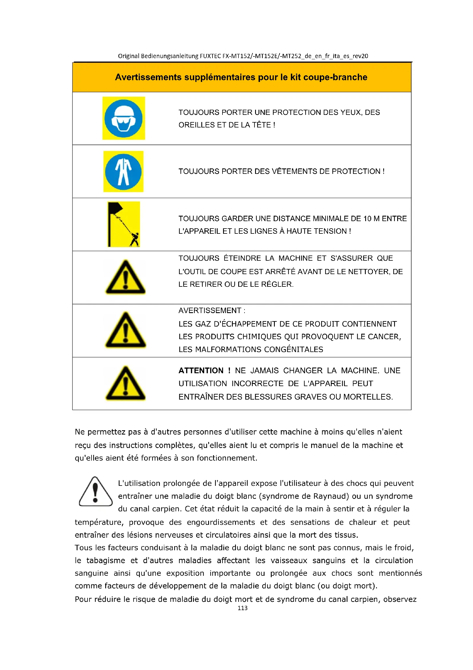 Ne permettez pas à d'autres personnes d'utiliser cette machine à moins qu'elles n'aient reçu des instructions complètes, qu'elles aient lu et compris le manuel de la machine et qu'elles aient été formées à son fonctionnement. L'utilisation prolongée de l'appareil expose l'utilisateur à des chocs qui peuvent entraîner une maladie du doigt blanc (syndrome de Raynaud) ou un syndrome du canal carpien. Cet état réduit la capacité de la main à sentir et à réguler la température, provoque des engourdissements et des sensations de chaleur et peut entraîner des lésions nerveuses et circulatoires ainsi que la mort des tissus. Tous les facteurs conduisant à la maladie du doigt blanc ne sont pas connus, mais le froid, le tabagisme et d'autres maladies affectant les vaisseaux sanguins et la circulation sanguine ainsi qu'une exposition importante ou prolongée aux chocs sont mentionnés comme facteurs de développement de la maladie du doigt blanc (ou doigt mort). Pour réduire le risque de maladie du doigt mort et de syndrome du canal carpien, observezOriginal Bedienungsanleitung FUXTEC FX-MT152/-MT152E/-MT252_de_en_fr_ita_es_rev20