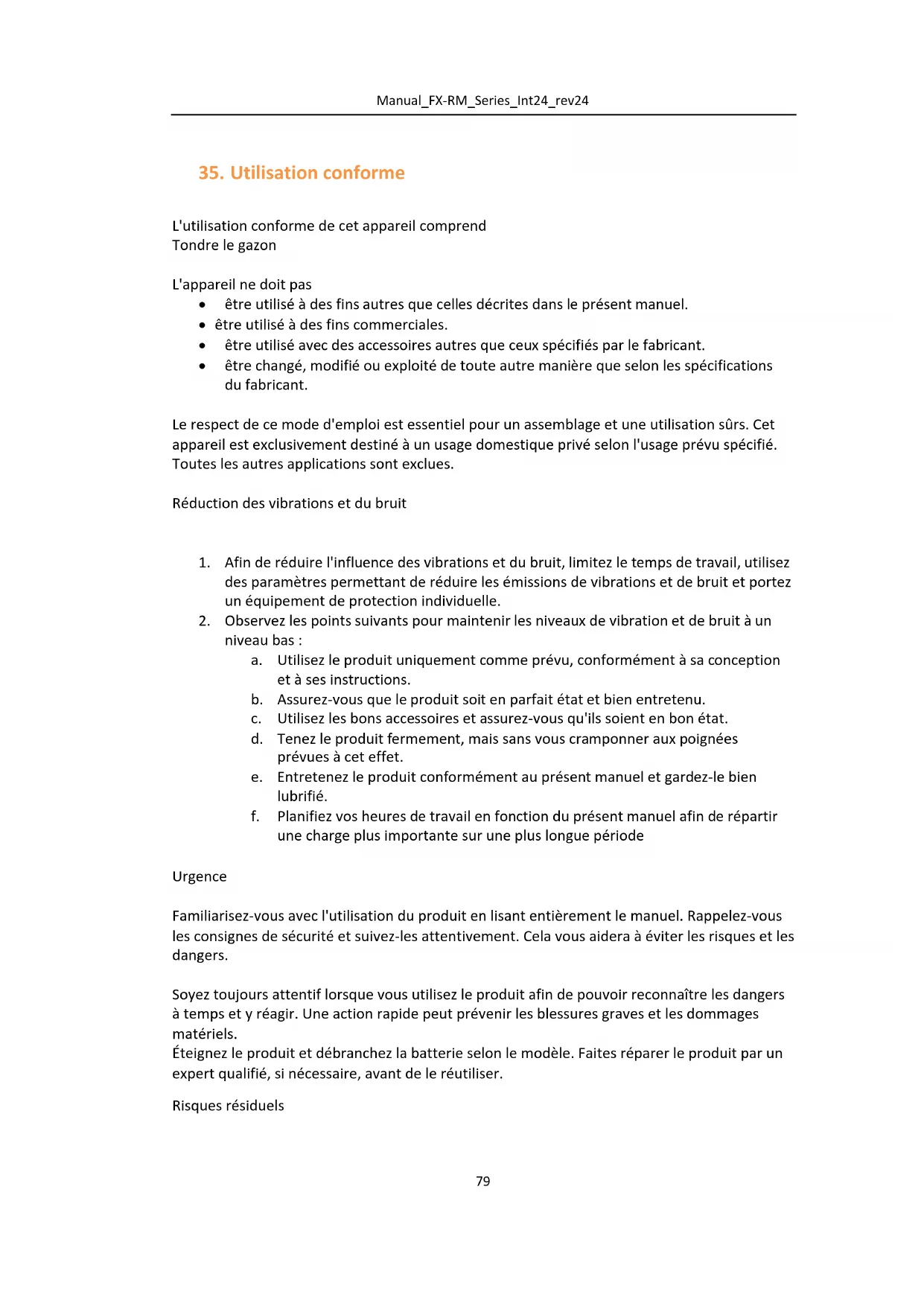 niveau bas : a. Utilisez le produit uniquement comme prévu, conformément à sa conception et à ses instructions. b. Assurez-vous que le produit soit en parfait état et bien entretenu. c. Utilisez les bons accessoires et assurez-vous qu'ils soient en bon état. d. Tenez le produit fermement, mais sans vous cramponner aux poignées prévues à cet effet. e. Entretenez le produit conformément au présent manuel et gardez-le bien lubrifié. f. Planifiez vos heures de travail en fonction du présent manuel afin de répartir une charge plus importante sur une plus longue période Urgence Familiarisez-vous avec l'utilisation du produit en lisant entièrement le manuel. Rappelez-vous les consignes de sécurité et suivez-les attentivement. Cela vous aidera à éviter les risques et les dangers. Soyez toujours attentif lorsque vous utilisez le produit afin de pouvoir reconnaître les dangers à temps et y réagir. Une action rapide peut prévenir les blessures graves et les dommages matériels. Éteignez le produit et débranchez la batterie selon le modèle. Faites réparer le produit par un expert qualifié, si nécessaire, avant de le réutiliser. Risques résiduelsManual_FX-RM_Series_Int24_rev24