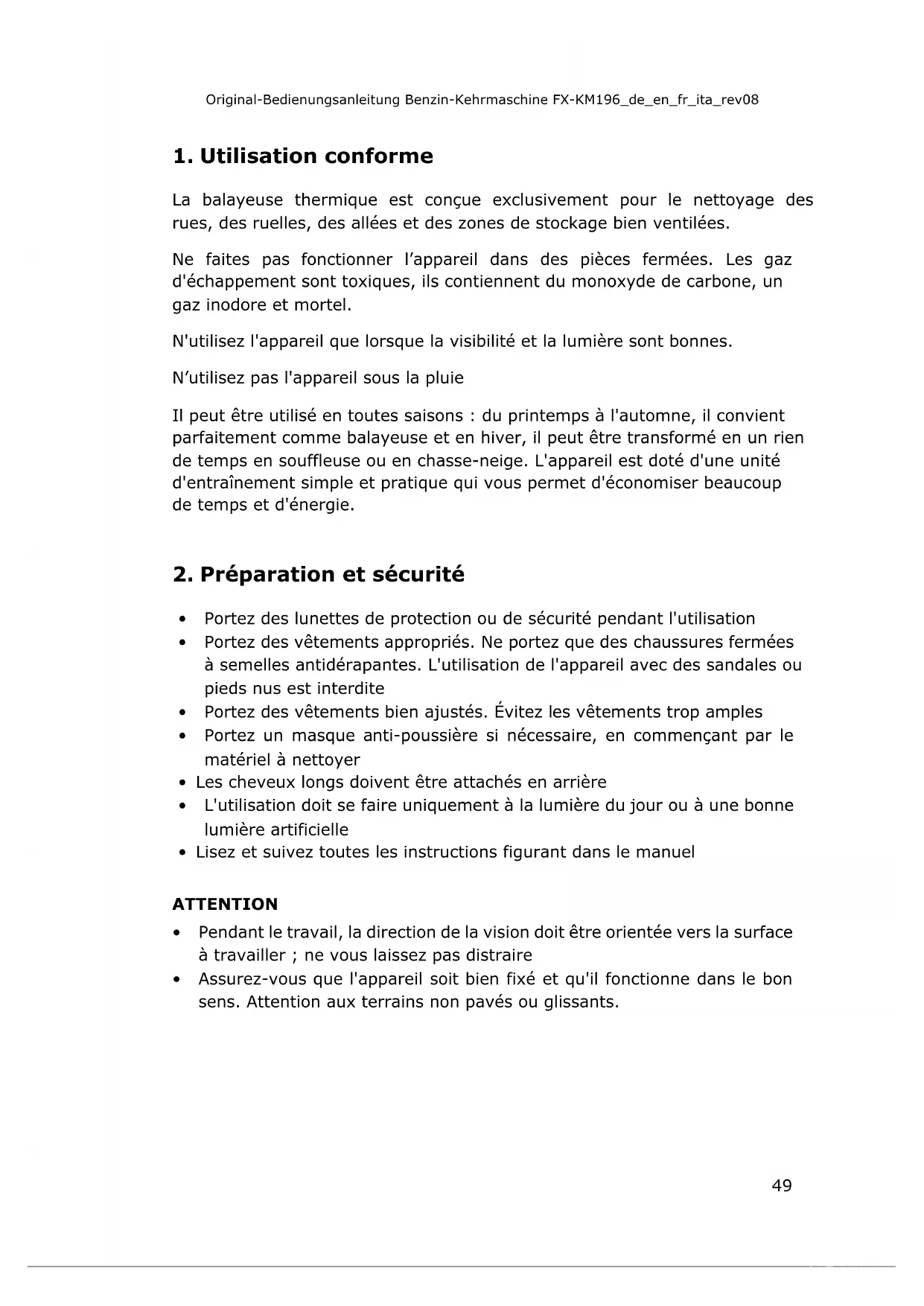 Vérifiez la zone de travail et veillez à ce qu'elle soit exempte de débris et d'objets étrangers pour éviter de trébucher. Travaillez sur une surface plane. Pendant le montage, l'installation, le fonctionnement, l'entretien et les réparations, tenez-vous à l'écart de toutes les pièces qui pourraient bouger. Démarrez l'appareil avec précaution en suivant les instructions d'utilisation et gardez les mains et les pieds à une distance suffisante des pièces en mouvement. Ne quittez jamais la zone de travail lorsque l'appareil est en marche. Tenez toujours l'appareil à deux mains pendant le fonctionnement. Saisissez l'appareil avec une prise ferme sur le guidon. Sachez que l'appareil peut faire des mouvements inattendus s’il rencontre des obstacles cachés tels que de grosses pierres ou autres. Ne marchez ou ne courez jamais lorsque vous utilisez l'appareil. Soyez particulièrement prudent lorsque vous faites marche arrière et lorsque vous déplacez l'appareil vers vous. Soyez particulièrement prudent lorsque vous travaillez sur ou traversez des routes de gravier, des trottoirs ou des chemins. Faites attention aux dangers cachés ou à la circulation. Soyez particulièrement prudent lorsque vous travaillez sur un sol gelé, car l'appareil peut glisser ou se renverser. Ne travaillez pas dans des zones où vous pourriez être coincé entre l'appareil et un autre objet. Éloignez l'appareil d'au moins 3 m du point où vous avez fait le plein de carburant avant de démarrer le moteur. Vérifiez toujours le niveau d'huile du moteur avant de le démarrer. N'utilisez pas l'appareil sur une route cahoteuse ou en pente. Marchez prudemment pour éviter de glisser et de tomber, surtout lorsque vous travaillez en marche arrière. Vérifiez le serrage de tous les écrous, boulons et brosses avant chaque opération afin de garantir la sécurité et la fiabilité de l'appareil.Original-Bedienungsanleitung Benzin-Kehrmaschine FX-KM196_de_en_fr_ita_rev08