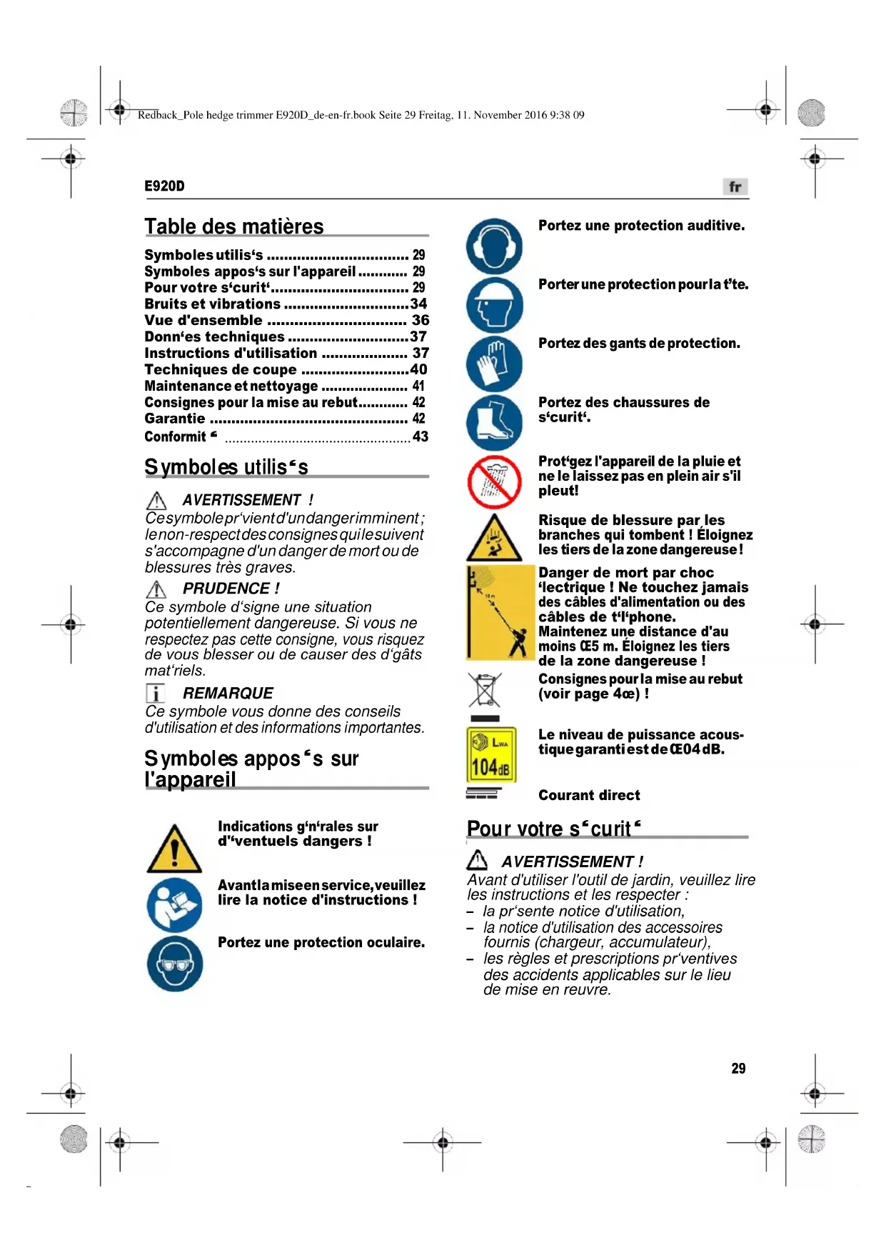 des vibrations, d‘finissez des mesures de s‘curit‘ suppl‘mentaires, dont par exemple : Maintenance de l'outil ‘lectrique et des outils install‘s, maintien des mains au chaud, organisation des s‘quences de travail. PRUDENCE ! Lorsque la pression acoustique d‘passe 85 dB(A), veuillez porter un casque antibruit.36 Redback_Pole hedge trimmer E920D_de-en-fr.book Seite 36 Freitag, 11. November 2016 9:38 09 E920D
