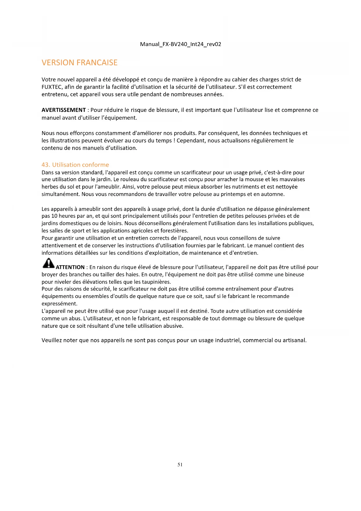 Dans sa version standard, l'appareil est conçu comme un scarificateur pour un usage privé, c'est-à-dire pour une utilisation dans le jardin. Le rouleau du scarificateur est conçu pour arracher la mousse et les mauvaises herbes du sol et pour l'ameublir. Ainsi, votre pelouse peut mieux absorber les nutriments et est nettoyée simultanément. Nous vous recommandons de travailler votre pelouse au printemps et en automne. Les appareils à ameublir sont des appareils à usage privé, dont la durée d'utilisation ne dépasse généralement pas 10 heures par an, et qui sont principalement utilisés pour l'entretien de petites pelouses privées et de jardins domestiques ou de loisirs. Nous déconseillons généralement l'utilisation dans les installations publiques, les salles de sport et les applications agricoles et forestières. Pour garantir une utilisation et un entretien corrects de l'appareil, nous vous conseillons de suivre attentivement et de conserver les instructions d'utilisation fournies par le fabricant. Le manuel contient des informations détaillées sur les conditions d'exploitation, de maintenance et d'entretien. ATTENTION : En raison du risque élevé de blessure pour l'utilisateur, l'appareil ne doit pas être utilisé pour broyer des branches ou tailler des haies. En outre, l'équipement ne doit pas être utilisé comme une bineuse pour niveler des élévations telles que les taupinières. Pour des raisons de sécurité, le scarificateur ne doit pas être utilisé comme entraînement pour d'autres équipements ou ensembles d'outils de quelque nature que ce soit, sauf si le fabricant le recommande expressément. L'appareil ne peut être utilisé que pour l'usage auquel il est destiné. Toute autre utilisation est considérée comme un abus. L'utilisateur, et non le fabricant, est responsable de tout dommage ou blessure de quelque nature que ce soit résultant d'une telle utilisation abusive. Veuillez noter que nos appareils ne sont pas conçus pour un usage industriel, commercial ou artisanal.52 Manual_FX-BV240_Int24_rev02