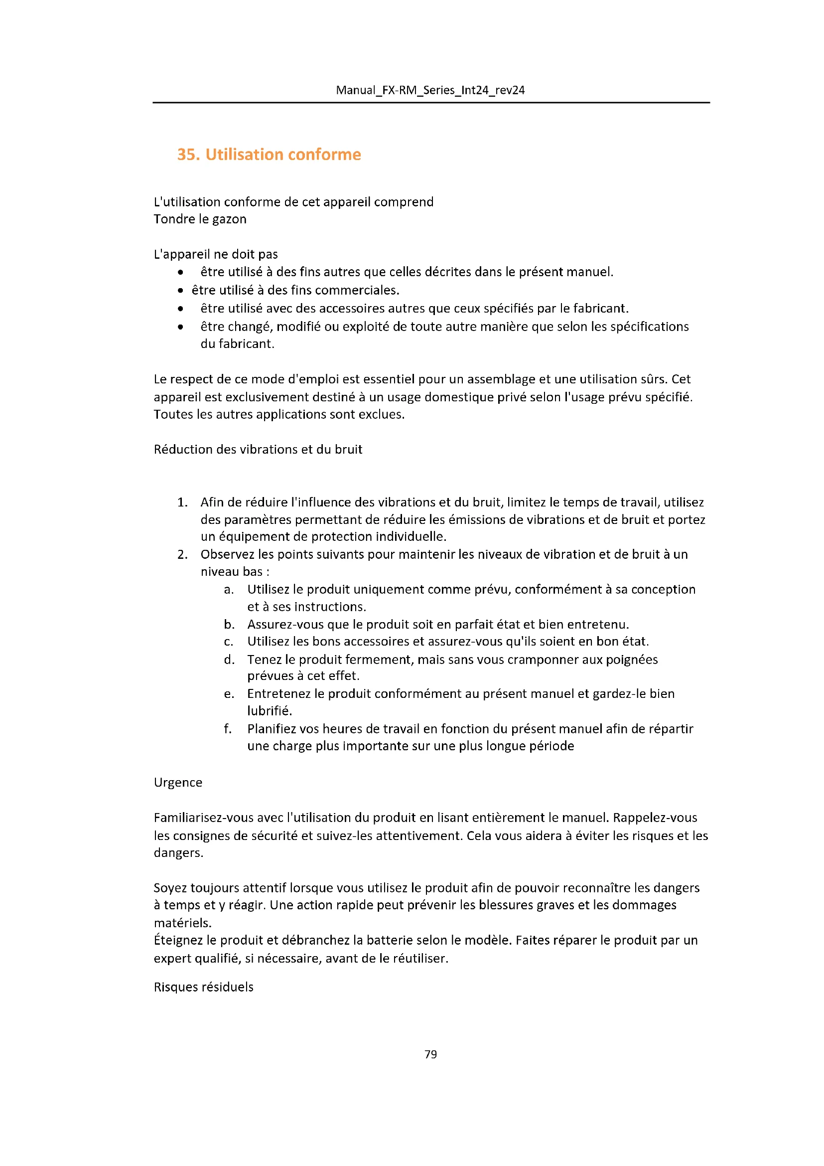 - Les dommages pour la santé résultant des vibrations des mains et des bras si la tondeuse est utilisée pendant une période prolongée ou si elle n'est pas correctement gérée et entretenueManual_FX-RM_Series_Int24_rev24