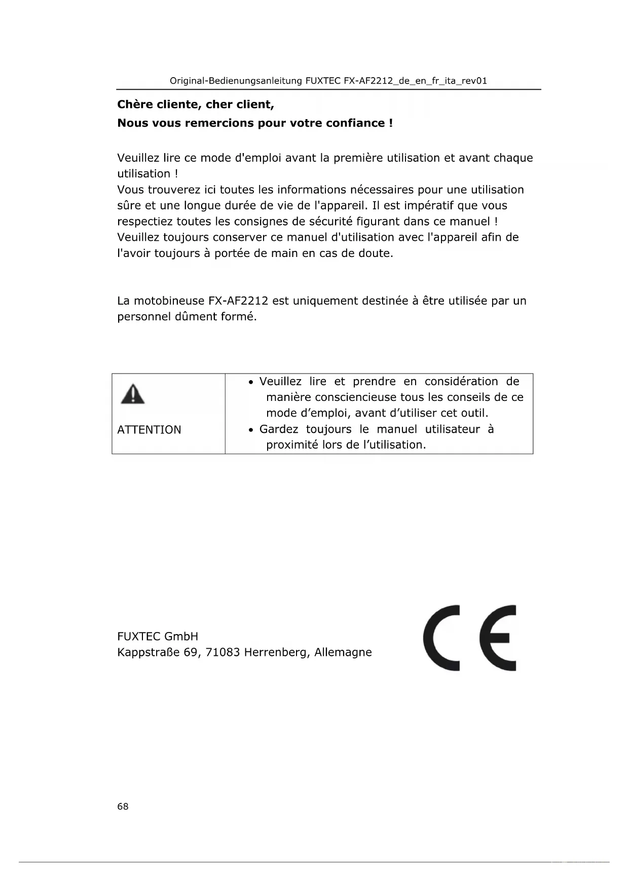 19.Portez toujours des chaussures robustes et des pantalons longs lorsque vous travaillez. Ne faites pas fonctionner l'appareil si vous portez des sandales ouvertes ou si vous marchez pieds nus. 20.Vérifiez la zone où l'appareil doit être utilisé et retirez tous les objets qui peuvent être projetés par ce dernier. 21.Assurez-vous par un examen visuel que les outils ne soient pas usés ou endommagés. Pour éviter tout déséquilibre, il faut toujours remplacer les lames et les vis usées ou endommagées par lots. 22.Le moteur doit être arrêté lors des travaux d'entretien et de nettoyage, lors du changement d'outils et du transport de l'appareil (sauf pour l'auto-traction). 23.Des dangers peuvent survenir lors de travaux en pente. 24.Lors de travaux sur des sols difficiles (pierreux ou durs), des dangers particuliers peuvent survenir. 25.L'appareil ne peut être utilisé que par des personnes dûment formées. 26.Des chaussures de sécurité doivent être portées lors de l'utilisation de l'appareil. 27.Limitez la durée d'utilisation et portez un équipement de protection individuelle pour réduire les dangers liés aux vibrations.Original-Bedienungsanleitung FUXTEC FX-AF2212_de_en_fr_ita_rev01