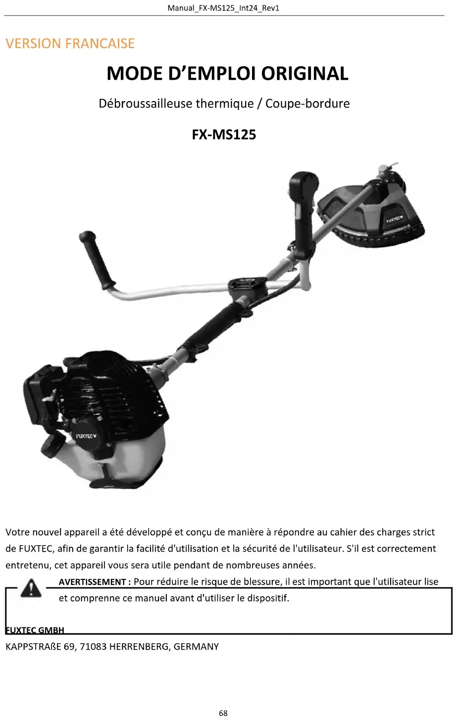 refroidies par air. Nous recommandons l'huile FUXTEC 2T originale "Made in Germany".Manual_FX-MS125_Int24_Rev1