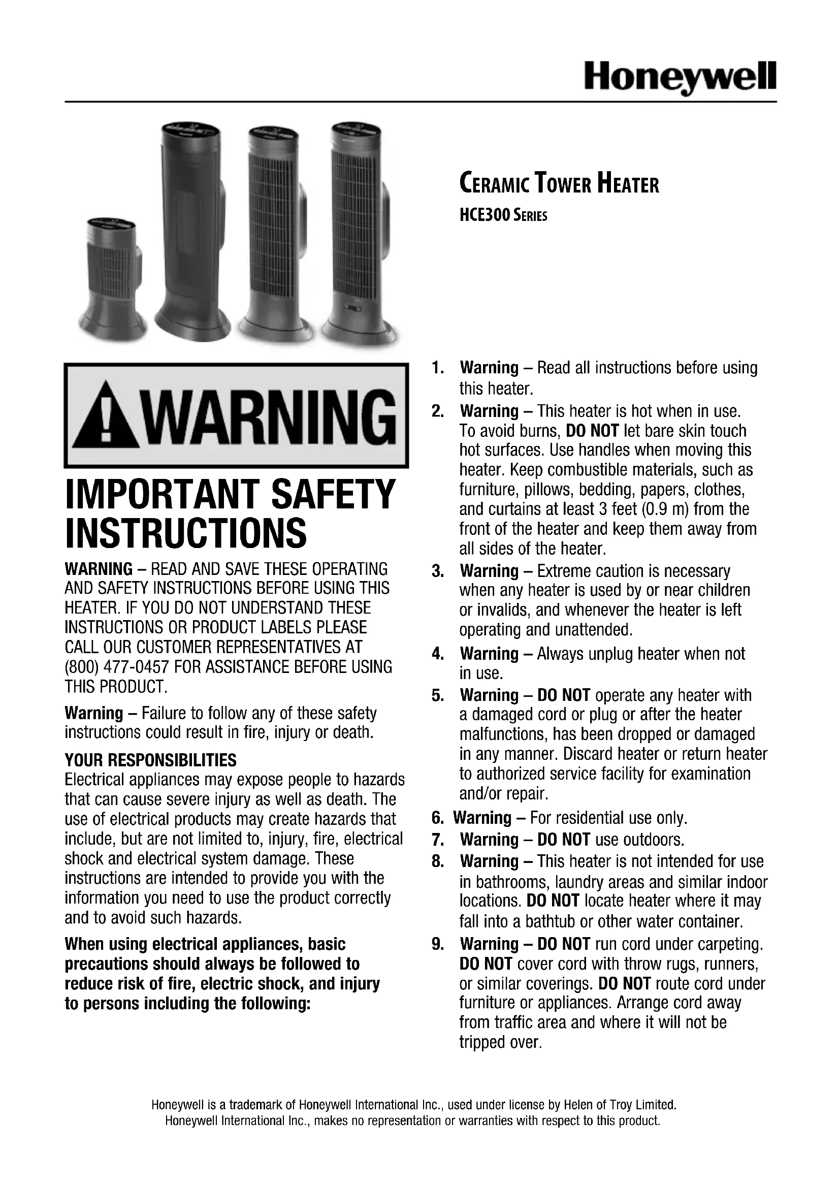 ÉlÉmenT CHauffanT en CÉramique SÉrie HCe300 AVERTISSEMENT Honeywell est une marque de commerce de Honeywell International, Inc. qu’utilise Helen of Troy Limited sous licence. Honeywell International Inc. ne fait aucune assertion et n’offre aucune garantie en ce qui concerne ce produit.8