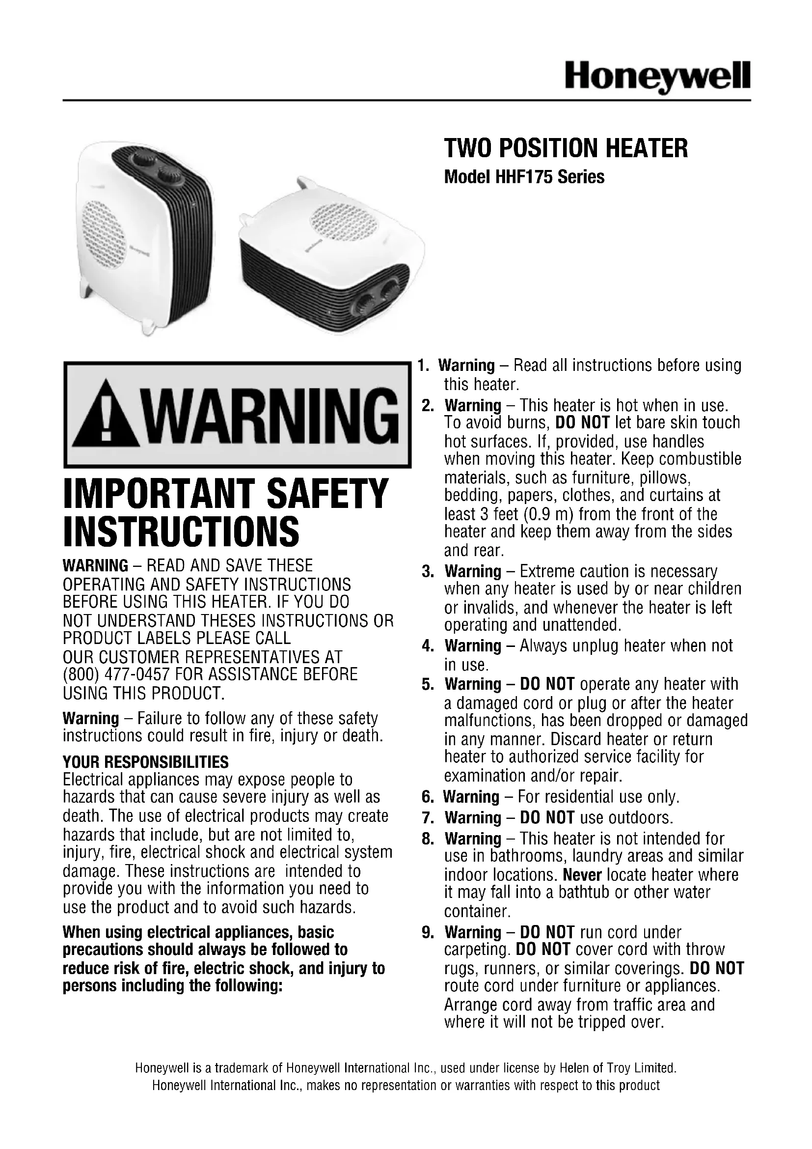 Téléchargez la notice de votre Chauffage au format PDF gratuitement ! Retrouvez votre notice HHF175 - HONEYWELL et reprennez votre appareil électronique en main. Sur cette page sont publiés tous les documents nécessaires à l'utilisation de votre appareil HHF175 de la marque HONEYWELL.
