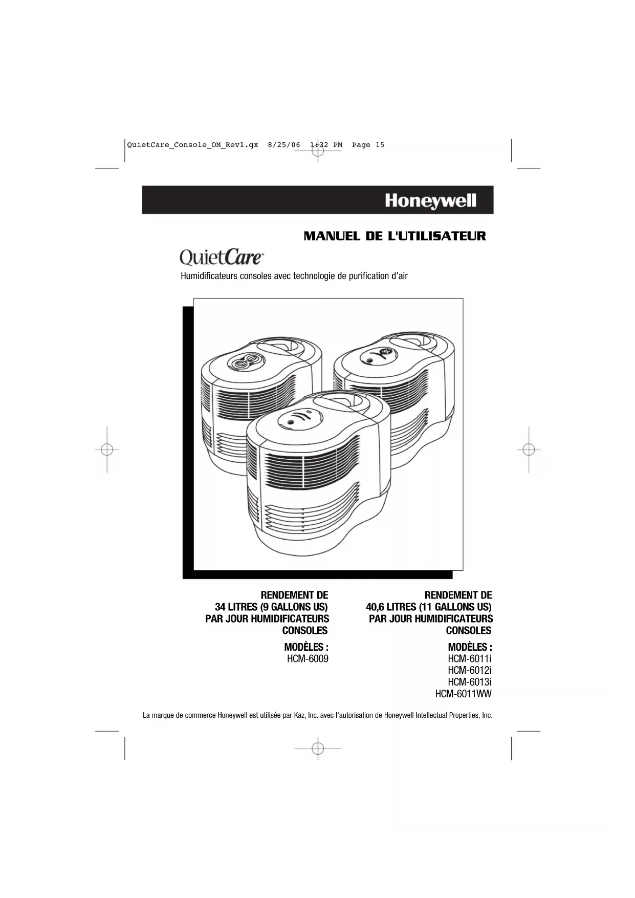 RELATIVE À CE PRODUIT A LA MÊME DURÉE LIMITE QUE LA PRÉSENTE GARANTIE. Dans certaines régions, on ne permet pas l'exclusion ou la limitation des dommages fortuits ou indirects, ni les limites de durée applicables à une garantie implicite; par conséquent, il est possible que ces limitations ou exclusions ne s'appliquent pas dans votre cas. Cette garantie vous confère des droits précis, reconnus par la loi. Ces droits diffèrent d'une région à l'autre, et il est possible que vous en ayez d'autres. Cette garantie s'applique uniquement à l'acheteur initial de ce produit, à compter de la date de l'achat initial. B. À sa discrétion, Kaz réparera ou remplacera ce produit si l'on constate qu'il comporte un vice de matière ou de main-d'œuvre. Tout produit défectueux devrait être retourné à l'endroit où il a été acheté, conformément à la politique du magasin. Par la suite, tout produit défectueux dont la garantie est toujours valide peut être retourné à Kaz. C. Cette garantie ne couvre pas les dommages découlant des tentatives de réparation non autorisées ou de toute utilisation non conforme au présent manuel. D. Retourner tout produit défectueux à Kaz, Incorporated, accompagné d'une brève description du problème. Inclure une preuve d'achat et un chèque ou un mandat de poste de 10,00 $US ou de 15,50 $CAN pour les frais de manutention, d'emballage de retour et d'expédition. Prière d'indiquer nom, adresse et numéro de téléphone durant la journée. Les frais d'expédition doivent être payés à l'avance. Adresser à : Aux États-Unis : Kaz, Incorporated Attn: Returns Department 4755 Southpoint Drive Memphis, TN 38118 USA Au Canada : Kaz, Incorporated Attn: Returns Department 510 Bronte Street South Milton (Ontario) L9T 2X6 Canada Garantie limitée de 5 ans QuietCare_Console_OM_Rev1.qx 8/25/06 1:32 PM Page 29QuietCare_Console_OM_Rev1.qx 8/25/06 1:32 PM Page 30MANUAL DE UTILIZACIÓN Kaz, Inc. utiliza la marca de comercio Honeywell con autorización de Honeywell Intellectual Properties, Inc. Humidificadores tipo consola con tecnología de purificación de aire RENDIMIENTO DE