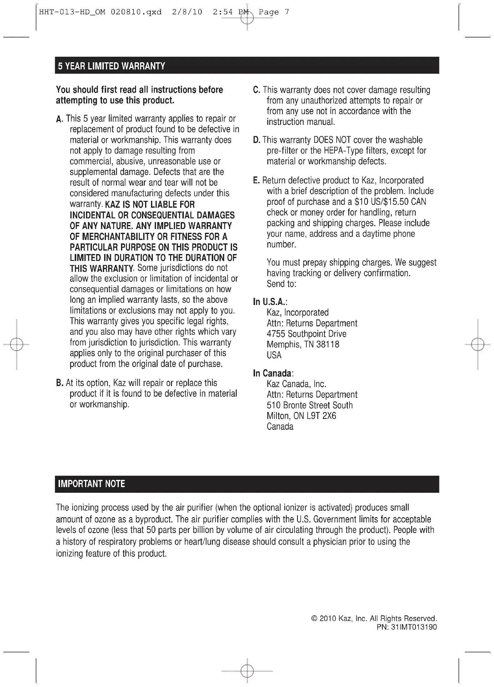 © 2010 Kaz, Inc. T ous droits réser vés. PN: 31IMT013190 Le procédé ionisant qu’utilise le purificateur d’air (quand l’ionisateur est activé) produit une faible quantité d’ozone comme sous-produit. Le purificateur d’air est conforme aux limites imposées par le gouvernement des États-Unis en matière de niveaux acceptables d’ozone (moins de 50 parties par milliard par volume d’air circulant dans l’appareil). Les personnes qui souffrent ou ont souffert de troubles respiratoires, de cardiopathie ou de maladies pulmonaires devraient consulter un médecin avant de commencer à utiliser la fonction d’ionisation de l’appareil.