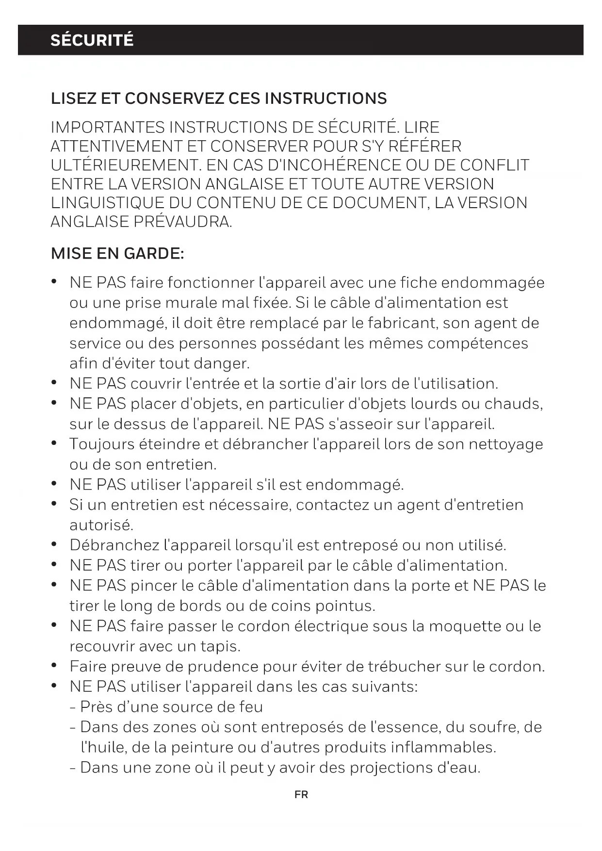 ATTENTIVEMENT ET CONSERVER POUR S'Y RÉFÉRER ULTÉRIEUREMENT. EN CAS D'INCOHÉRENCE OU DE CONFLIT ENTRE LA VERSION ANGLAISE ET TOUTE AUTRE VERSION LINGUISTIQUE DU CONTENU DE CE DOCUMENT, LA VERSION ANGLAISE PRÉVAUDRA. MISE EN GARDE: NE PAS faire fonctionner l'appareil avec une fiche endommagée ou une prise murale mal fixée. Si le câble d'alimentation est endommagé, il doit être remplacé par le fabricant, son agent de service ou des personnes possédant les mêmes compétences afin d'éviter tout danger. NE PAS couvrir l'entrée et la sortie d'air lors de l'utilisation. NE PAS placer d'objets, en particulier d'objets lourds ou chauds, sur le dessus de l'appareil. NE PAS s'asseoir sur l'appareil. Toujours éteindre et débrancher l'appareil lors de son nettoyage ou de son entretien. NE PAS utiliser l'appareil s'il est endommagé. Si un entretien est nécessaire, contactez un agent d'entretien autorisé. Débranchez l'appareil lorsqu'il est entreposé ou non utilisé. NE PAS tirer ou porter l'appareil par le câble d'alimentation. NE PAS pincer le câble d'alimentation dans la porte et NE PAS le tirer le long de bords ou de coins pointus. NE PAS faire passer le cordon électrique sous la moquette ou le recouvrir avec un tapis. Faire preuve de prudence pour éviter de trébucher sur le cordon. NE PAS utiliser l'appareil dans les cas suivants: - Près d’une source de feu - Dans des zones où sont entreposés de l'essence, du soufre, de l'huile, de la peinture ou d'autres produits inflammables. - Dans une zone où il peut y avoir des projections d'eau. FRSÉCURITÉ (SUITE)