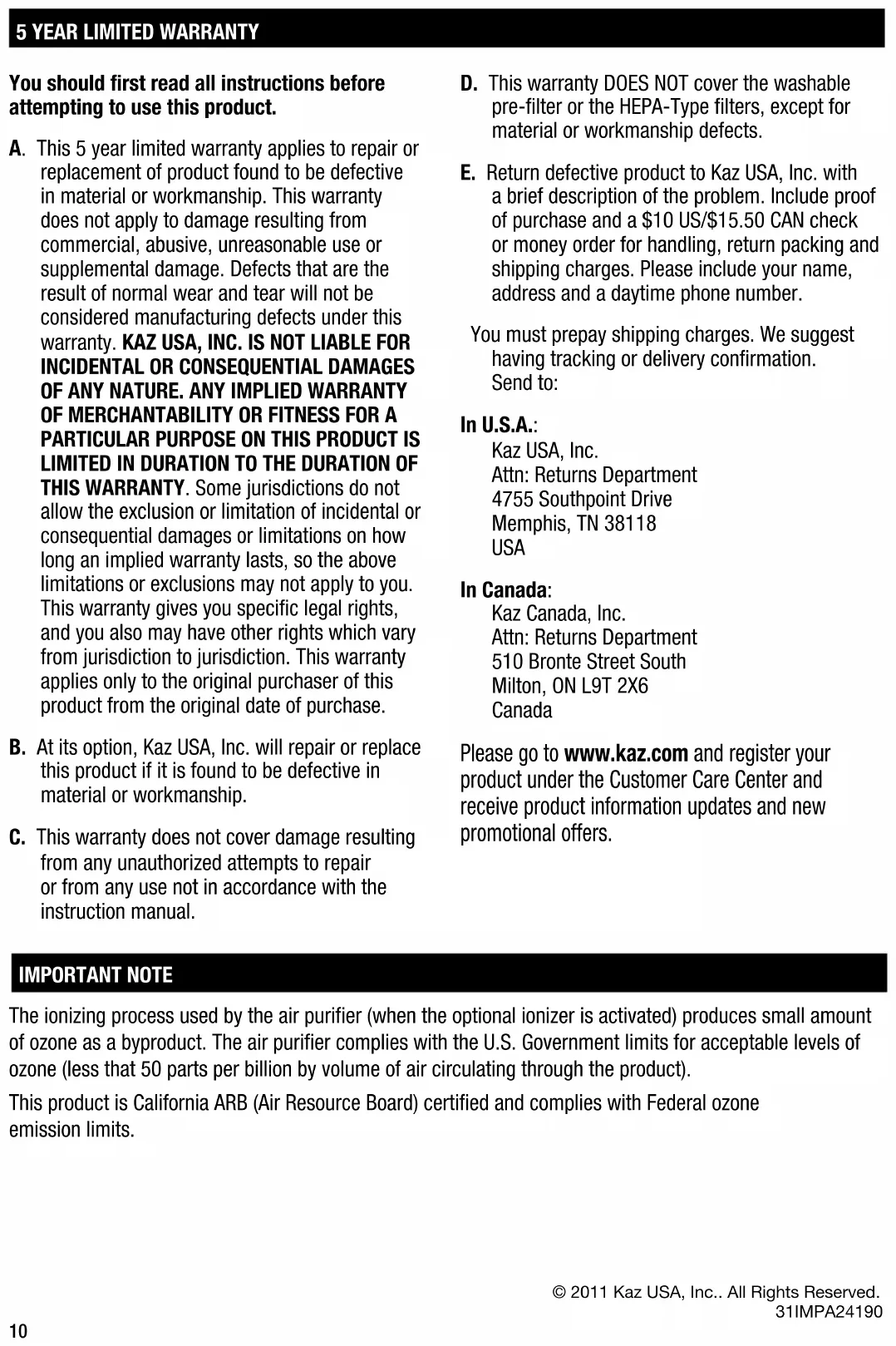 Le procédé ionisant qu’utilise le purificateur d’air (quand l’ionisateur est activé) produit une faible quantité d’ozone comme sous-produit. Le purificateur d’air est conforme aux limites imposées par le gouvernement des États-Unis en matière de niveaux acceptables d’ozone (moins de 50 parties par milliard par volume d’air circulant dans l’appareil). Ce produit est homologué ARB (Air Resource Board) en Californie et satisfait aux limites fédérales d’émission d’ozone. © 2011 Kaz USA, Inc.. Tous droits réservés. 31IMPA24190 REMARQUE IMPORTANTE Prière de lire toutes les instructions avant de tenter d’utiliser ce produit. A. Cette garantie limitée de 5 ans s’applique à la réparation ou au remplacement d’un produit comportant un vice de matière ou de main- d’œuvre. Cette garantie ne s’applique pas aux dommages découlant d’un usage commercial, abusif ou déraisonnable, ni aux dommages supplémentaires. Les défaillances résultant de l’usure normale ne sont pas considérées comme des vices de fabrication en vertu de la présente garantie. KAZ USA, INC. N’EST