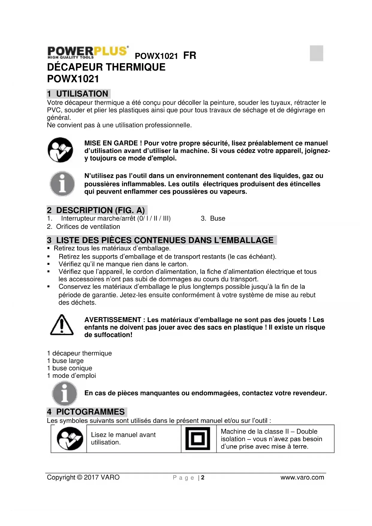 Machine de la classe II – Double isolation – vous n’avez pas besoin d’une prise avec mise à terre.POWX1021 FR Copyright © 2017 VARO P a g e | 3 www.varo.com