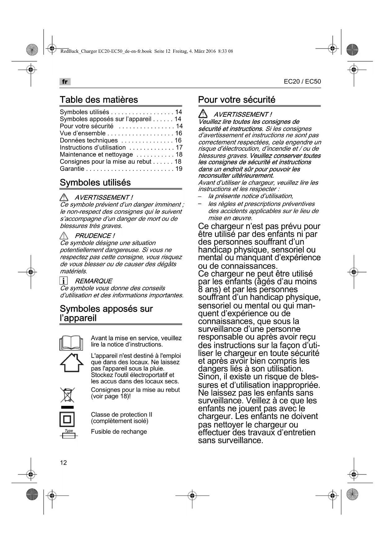 Garantie Ce produit a ‘t‘ fabriqu‘ selon des normes de qualit‘ ‘lev‘es. L'achat d'un nouveau produit permet de b‘n‘ficier d'une garantie du fabricant de 24 mois à partir de la date d'achat. La garantie couvre uniquement les d‘fauts imputables à des vices de matière et/ou de fabrication ainsi qu'à l'absence des caract‘ristiques garanties. En cas de recours en garantie, munissez-vous de la preuve d'achat originale comportant la date d'achat. Les r‘parations sous garantie ne pourront ’tre r‘alis‘es que par des ateliers ou points de service après-vente agr‘‘s. La garantie n'est valide que si la machine a ‘t‘ utilis‘e de manière conforme. Sont exclus de la garantie tous les dommages ayant les causes suivantes : – Utilisation non conforme, surcharge de la machine ou n‘gligence ; – Utilisation professionnelle (industrie, artisanat, location) ; – R‘parations par des personnes non autoris‘es ; – Dommages caus‘s par des facteurs ext‘rieurs, des corps ‘trangers, des substances ou des accidents. RedBack_Charger EC20-EC50_de-en-fr.book Seite 17 Freitag, 4. März 2016 8:33 08Declaration of Conformity We hereby declare, that the following product in its design and construction put by us into circulation is in accordance with the appropriate basic safety and health requirements of the following directives (see item 4). This declaration relates exclusively to the machinery in the state in which it was placed on the market, and excludes components which are added and/or operations carried out subsequently by the final user.