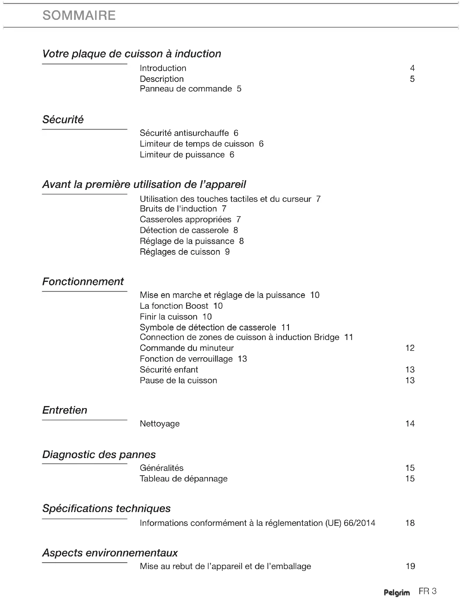 - CFK-vrij polystyreen (PS-hardschuim). Deze materialen moeten op verantwoorde wijze en conform de overheidsvoorschriften worden afgedankt. Om te wijzen op de noodzaak van gescheiden inzameling van elektrische huishoudelijke apparatuur, is op het product het symbool van een doorgekruiste vuilnisbak aangebracht. Dit betekent dat het apparaat aan het einde van zijn levensduur niet met het gewone huisvuil mag worden meegegeven. Het apparaat moet naar een speciaal centrum voor gescheiden afvalinzameling van de gemeente worden gebracht of naar een verkooppunt dat deze dienst aanbiedt. Het apart inleveren van huishoudelijke apparaten voorkomt mogelijk negatieve gevolgen voor het milieu en de gezondheid, en zorgt ervoor dat de materialen in deze apparaten kunnen worden teruggewonnen, waardoor in aanzienlijke mate kan worden bespaard op energie en grondstoffen. Verklaring van conformiteit Wij verklaren dat onze producten voldoen aan de toepasselijke Europese richtlijnen, normen en voorschriften, evenals aan alle vereisten in de normen waarnaar wordt verwezen.NL 20FR 3 SOMMAIRE Votre plaque de cuisson à induction Introduction 4 Description 5 Panneau de commande 5 Sécurité Sécurité antisurchauffe 6 Limiteur de temps de cuisson 6 Limiteur de puissance 6 Avant la première utilisation de l’appareil Utilisation des touches tactiles et du curseur 7 Bruits de l'induction 7 Casseroles appropriées 7 Détection de casserole 8 Réglage de la puissance 8 Réglages de cuisson 9 Fonctionnement Mise en marche et réglage de la puissance 10 La fonction Boost 10 Finir la cuisson 10 Symbole de détection de casserole 11 Connection de zones de cuisson à induction Bridge 11 Commande du minuteur 12 Fonction de verrouillage 13 Sécurité enfant 13 Pause de la cuisson 13 Entretien Nettoyage 14 Diagnostic des pannes Généralités 15 Tableau de dépannage 15 Spécifications techniques Informations conformément à la réglementation (UE) 66/2014 18 Aspects environnementaux Mise au rebut de l’appareil et de l’emballage 19FR 4 Introduction Nous vous félicitons d’avoir choisi cet appareil. La souplesse et la simplicité de l’utilisation sont les principes qui ont guidé son développement. Ce manuel vous explique comment utiliser cet appareil de manière optimale. En plus des informations relatives au fonctionnement de l’appareil, vous y trouverez des renseignements de base susceptibles d’en faciliter l’utilisation. Veuillez lire attentivement les consignes de sécurité fournies séparément avant toute utilisation de l’appareil. Lisez attentivement cette notice d’utilisation avant d’utiliser l’appareil et rangez-la en lieu sûr pour la consulter ultérieurement. Ce manuel sert également de document de référence pour le service après-vente. Veuillez coller l’étiquette signalétique de l’appareil dans le rectangle au verso du manuel. L’étiquette signalétique mentionne toutes les informations nécessaires au service après-vente pour répondre à vos besoins et questions de façon satisfaisante. Les instructions d’installation sont fournies séparément. Nous vous souhaitons bien du plaisir culinaire! Vous pouvez trouver la version la plus récente de le mode d’emploi sur notre site Web.