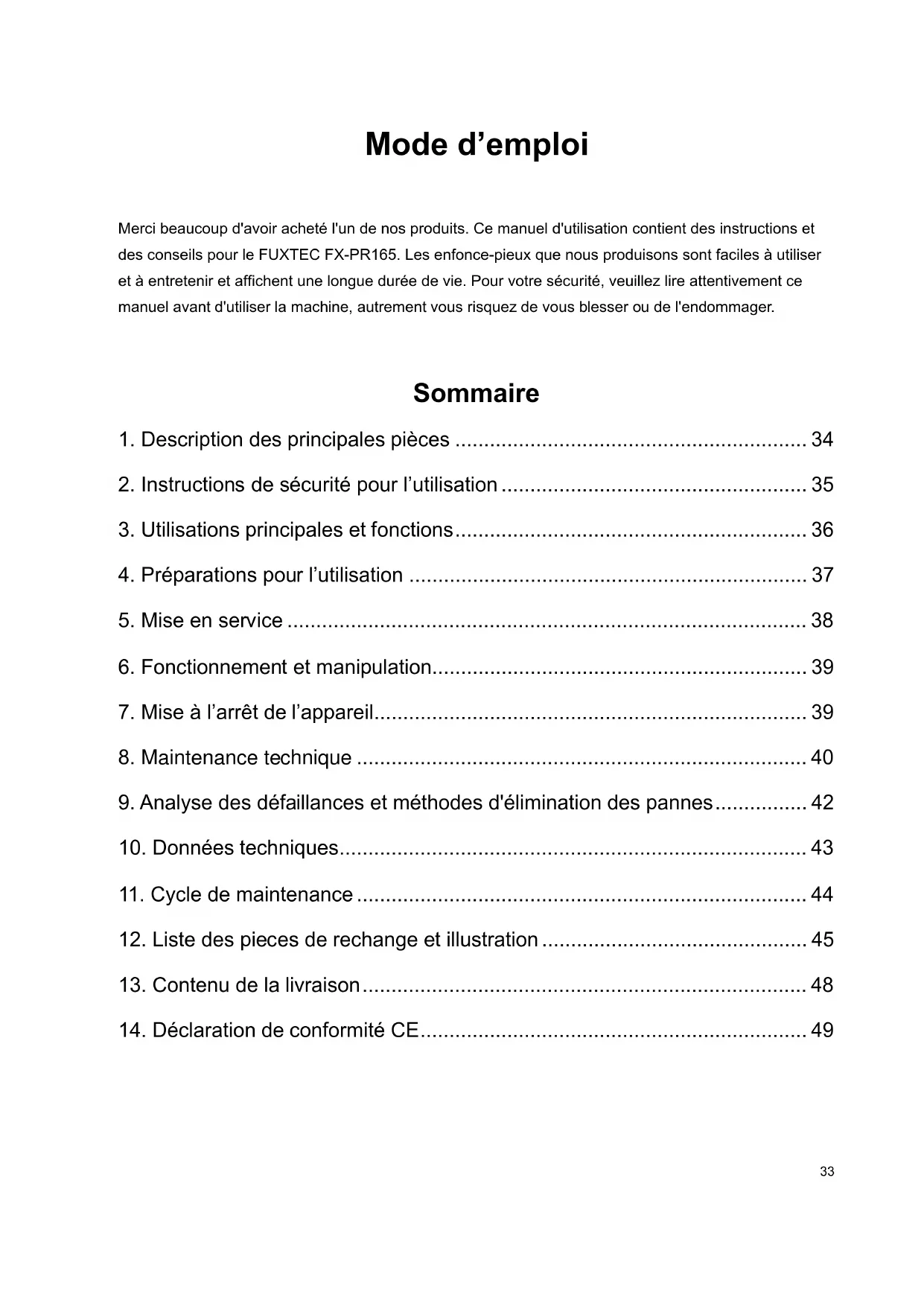 Pile driver Piling Socket Retainer 20~45mm and 46~80mm Oil pot for gasoline mixture Special oil/grease for cylinder (60g) Rubber ring (wearing part) Instructions The tool package 1 piece of spark plug, 1 piece of spark plug handle, 1 piece of 4mm inner hexagon spanner 1 piece of 5mm inner hexagon spanner 1 piece of 6mm inner hexagon spanner 1 piece of T-shaped inner hexagon spanner 1 piece of straight screw-driver 1 piece of 8-10mm open spanner33 Mode d’emploi Merci beaucoup d'avoir acheté l'un de nos produits. Ce manuel d'utilisation contient des instructions et des conseils pour le FUXTEC FX-PR165. Les enfonce-pieux que nous produisons sont faciles à utiliser et à entretenir et affichent une longue durée de vie. Pour votre sécurité, veuillez lire attentivement ce manuel avant d'utiliser la machine, autrement vous risquez de vous blesser ou de l'endommager.