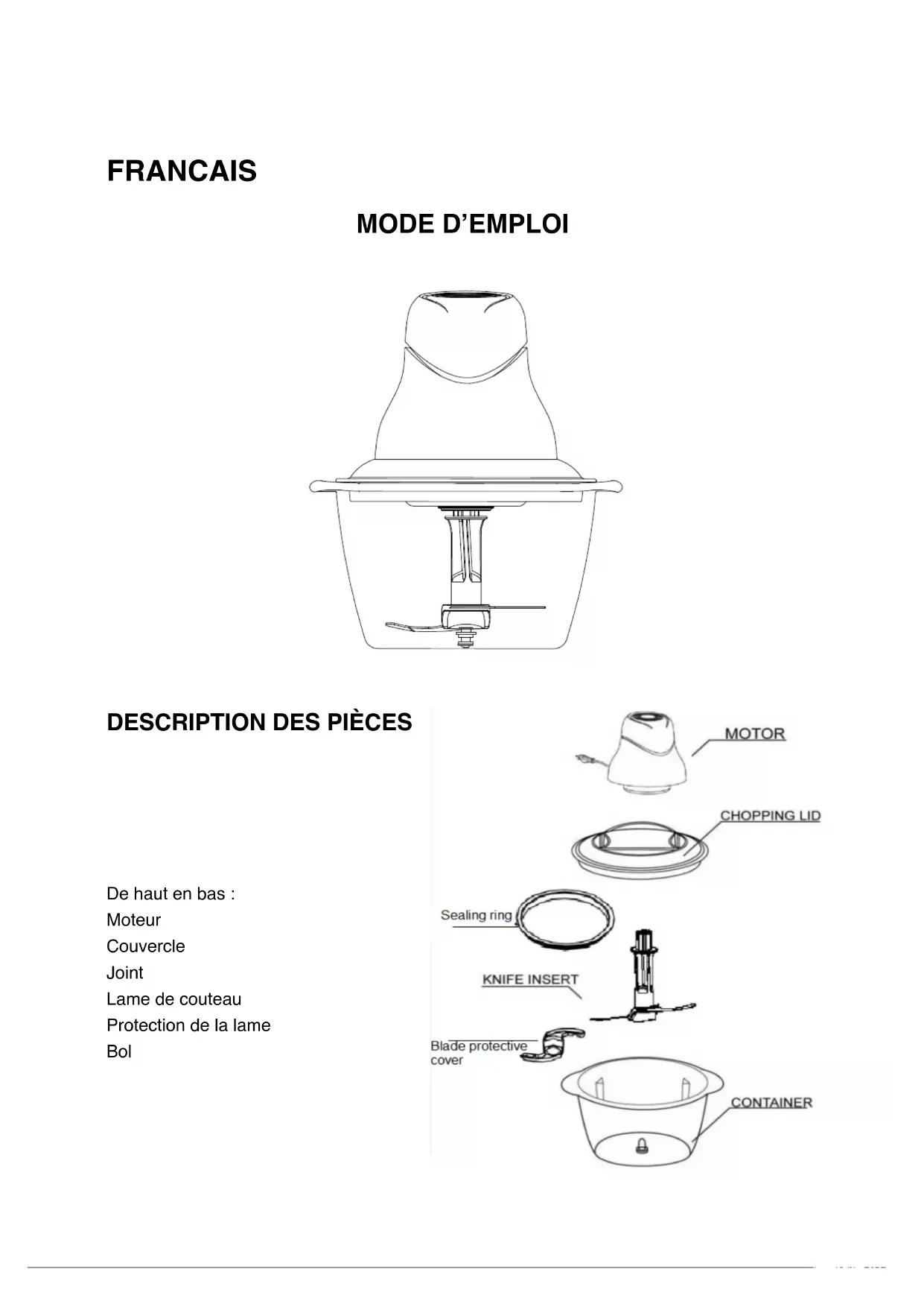 De haut en bas : Moteur Couvercle Joint Lame de couteau Protection de la lame BolCONSIGNES DE SECURITE