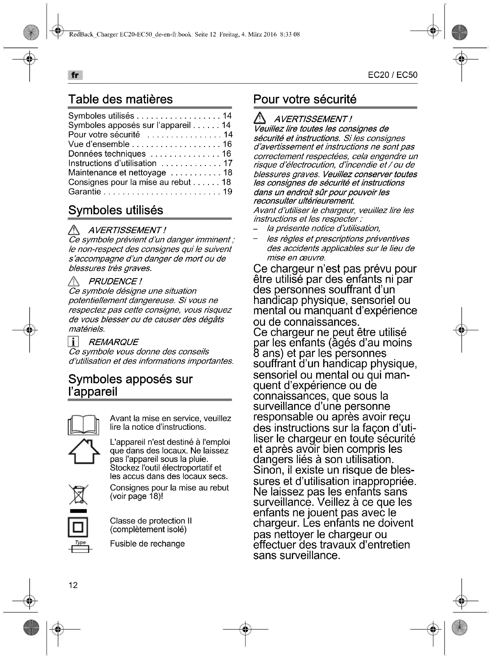 Garantie Ce produit a ‘t‘ fabriqu‘ selon des normes de qualit‘ ‘lev‘es. L'achat d'un nouveau produit permet de b‘n‘ficier d'une garantie du fabricant de 24 mois à partir de la date d'achat. La garantie couvre uniquement les d‘fauts imputables à des vices de matière et/ou de fabrication ainsi qu'à l'absence des caract‘ristiques garanties. En cas de recours en garantie, munissez-vous de la preuve d'achat originale comportant la date d'achat. Les r‘parations sous garantie ne pourront ’tre r‘alis‘es que par des ateliers ou points de service après-vente agr‘‘s. La garantie n'est valide que si la machine a ‘t‘ utilis‘e de manière conforme. Sont exclus de la garantie tous les dommages ayant les causes suivantes : – Utilisation non conforme, surcharge de la machine ou n‘gligence ; – Utilisation professionnelle (industrie, artisanat, location) ; – R‘parations par des personnes non autoris‘es ; – Dommages caus‘s par des facteurs ext‘rieurs, des corps ‘trangers, des substances ou des accidents. RedBack_Charger EC20-EC50_de-en-fr.book Seite 17 Freitag, 4. März 2016 8:33 08Declaration of Conformity We hereby declare, that the following product in its design and construction put by us into circulation is in accordance with the appropriate basic safety and health requirements of the following directives (see item 4). This declaration relates exclusively to the machinery in the state in which it was placed on the market, and excludes components which are added and/or operations carried out subsequently by the final user.