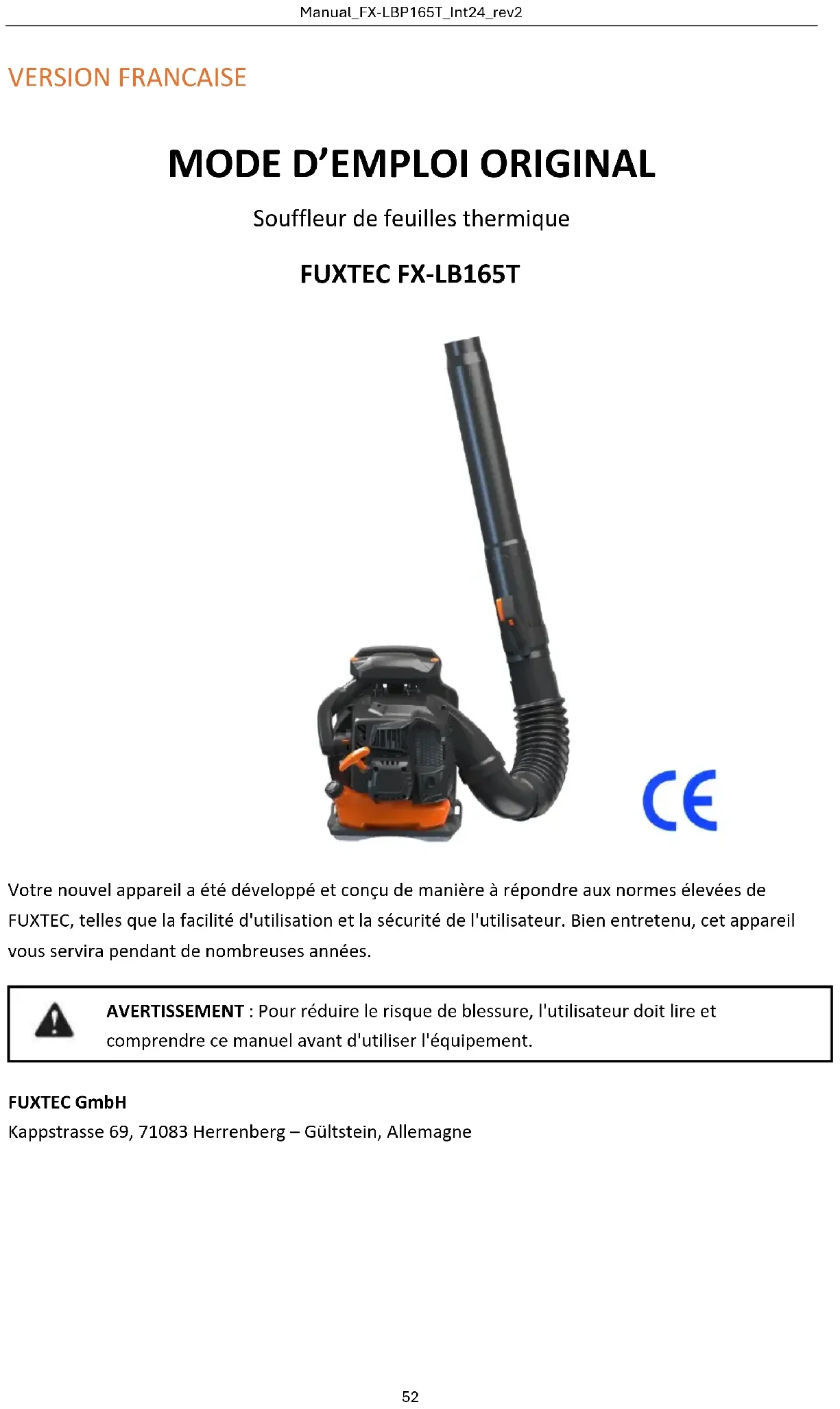 comprendre ce manuel avant d'utiliser l'équipement. FUXTEC GmbH Kappstrasse 69, 71083 Herrenberg – Gültstein, AllemagneManual_FX-LBP165T_Int24_rev2