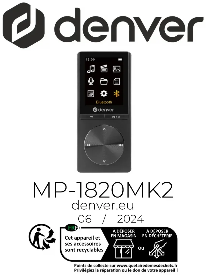 Leséquipementsélectriquesetélectroniquesetles pilesinclusescontiennentdesmatériaux,des composantsetdessubstancesquipeuventêtre dangereuxpourlasantéetl'environnementsiles déchets(équipementsélectriquesetélectroniqueset pilesmisaurebut)nesontpastraitéscorrectement. Leséquipementsélectriquesetélectroniquesetles pilessontmarquésparlesymboledelapoubelle barrée,visibleci-dessus.Cesymbolesignifiequeles équipementsélectriquesetélectroniquesetlespiles nedoiventpasêtrejetésaveclesautresdéchets ménagers,maisdoiventêtreéliminésséparément. Entantqu'utilisateurfinal,ilestimportantquevous remettiezvospilesusagéesàl'installationappropriée etdésignée.Vousvousassurezainsiquelespilessont recycléesconformémentàlalégislationetqu'ellesne nuisentpasàl'environnement. Touteslesvillesontmisenplacedespointsdecollecte, oùleséquipementsélectriquesetélectroniquesetles pilespeuventêtredéposésgratuitementdansles stationsderecyclageetautressitesdecollecte,ouêtre collectésauprèsdesménages.Desinformations supplémentairessontdisponiblesauprèsduservice techniquedevotreville.FRA14 Parlaprésente,DenverA/Sdéclarequel'équipement radiodetypeMP-1820MK2estconformeàladirective 2014/53/UE.Letexteintégraldeladéclarationde conformitédel'UEestdisponibleàl'adresseInternet suivante:denver.eu,puiscliquezsurl'icônede recherchesurlalignesupérieuredusiteWeb.Inscrivez lenumérodemodèle:MP-1820MK2.Entrezmainte- nantdanslapageduproduit,etladirectiveREDse trouvesousdownloads/autrestéléchargements. Gammedefréquencesdefonctionnement: 2402-2480GHz Puissancedesortiemaximale:3,30dBm DENVERA/S Omega5A,Soeften DK-8382Hinnerup Danemark www.facebook.com/denver.euContact Nordics Headquarter Denver A/S Omega5A,Soeften DK-8382Hinnerup Denmark Phone: +45 8622 6100(Push“1”forsupport) E-Mail Fortechnicalquestions,pleasewriteto: support.hq@denver.eu Forallotherquestionspleasewriteto: contact.hq@denver.eu Benelux DENVER BENELUX B.V. Barwoutswaarder13C+D 3449HEWoerden The Netherlands Phone: 0900-3437623 E-Mail: support.nl@denver.euSpain/Portugal