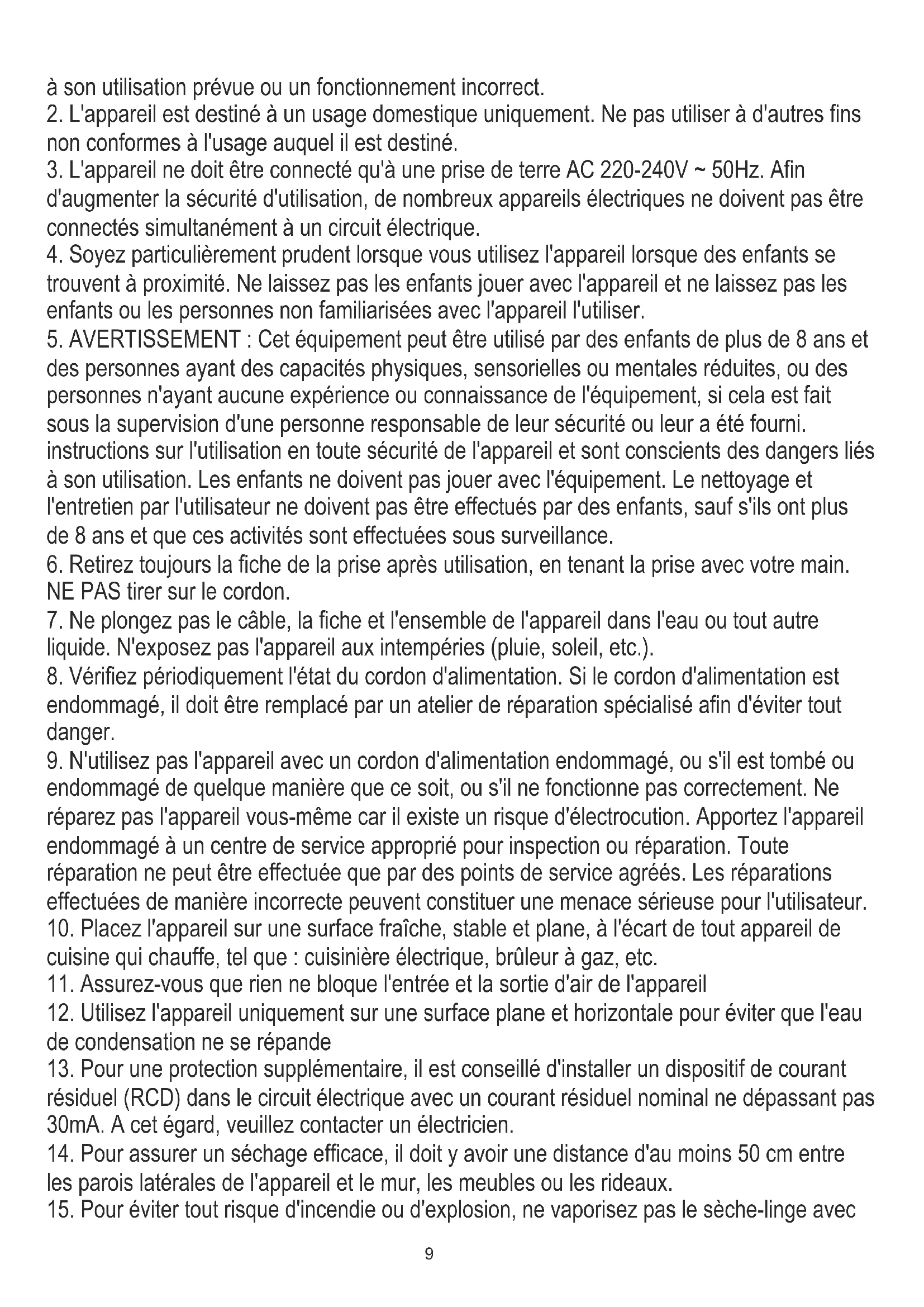 9. N'utilisez pas l'appareil avec un cordon d'alimentation endommagé, ou s'il est tombé ou