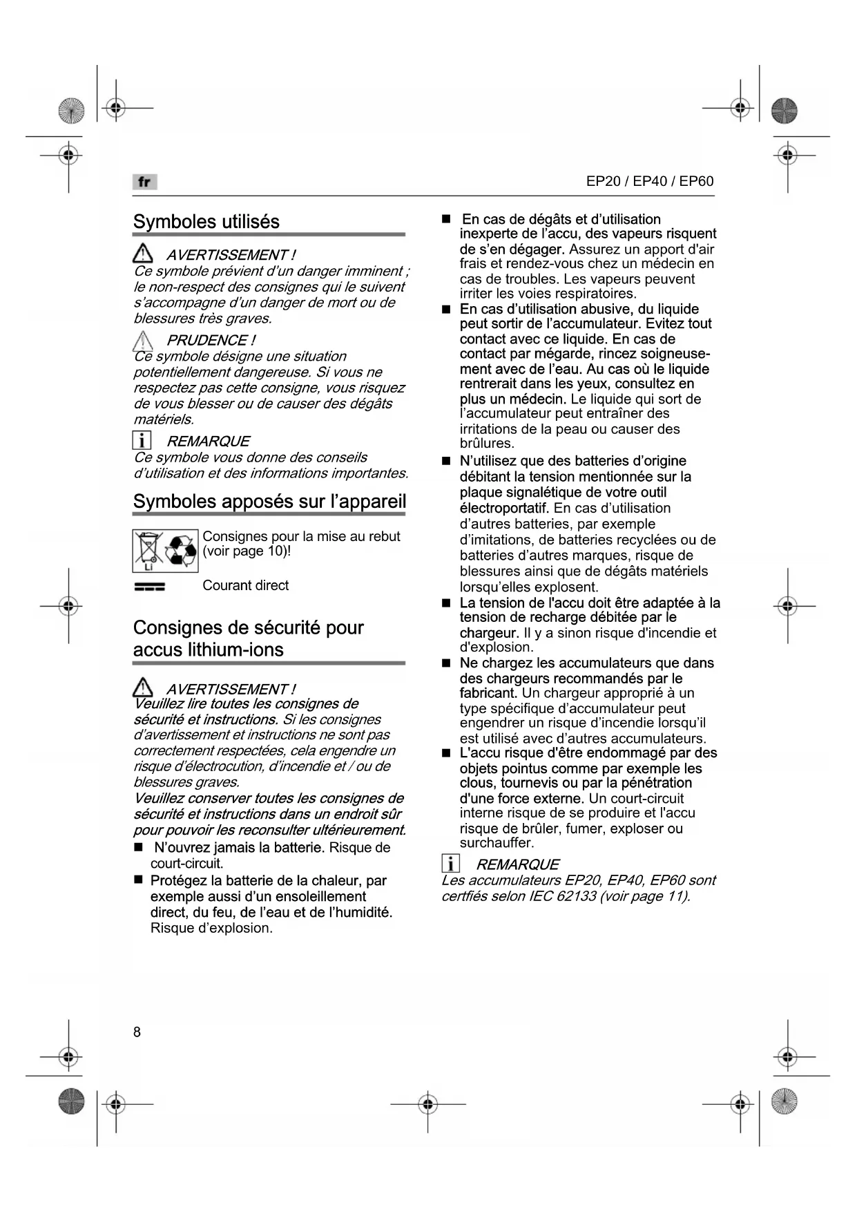 L'accu risque d'’tre endommag‘ par des objets pointus comme par exemple les clous, tournevis ou par la p‘n‘tration d'une force externe. Un court-circuit interne risque de se produire et l'accu risque de brûler, fumer, exploser ou surchauffer. REMARQUE Les accumulateurs EP20, EP40, EP60 sont certfi‘s selon IEC 62133 (voir page 11). Consignes pour la mise au rebut (voir page 10)! Courant directEP20 / EP40 / EP60