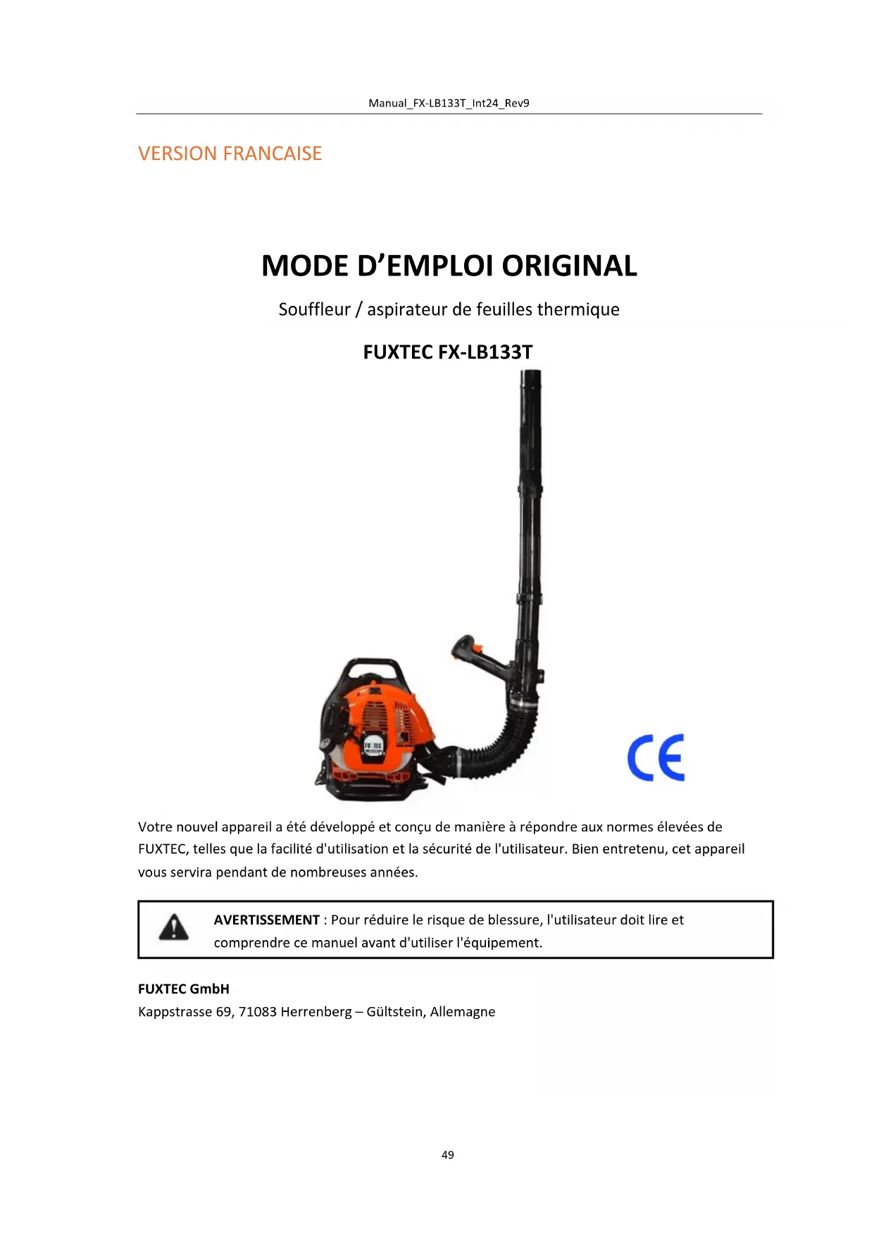 comprendre ce manuel avant d'utiliser l'équipement. FUXTEC GmbH Kappstrasse 69, 71083 Herrenberg – Gültstein, AllemagneManual_FX-LB133T_Int24_Rev9