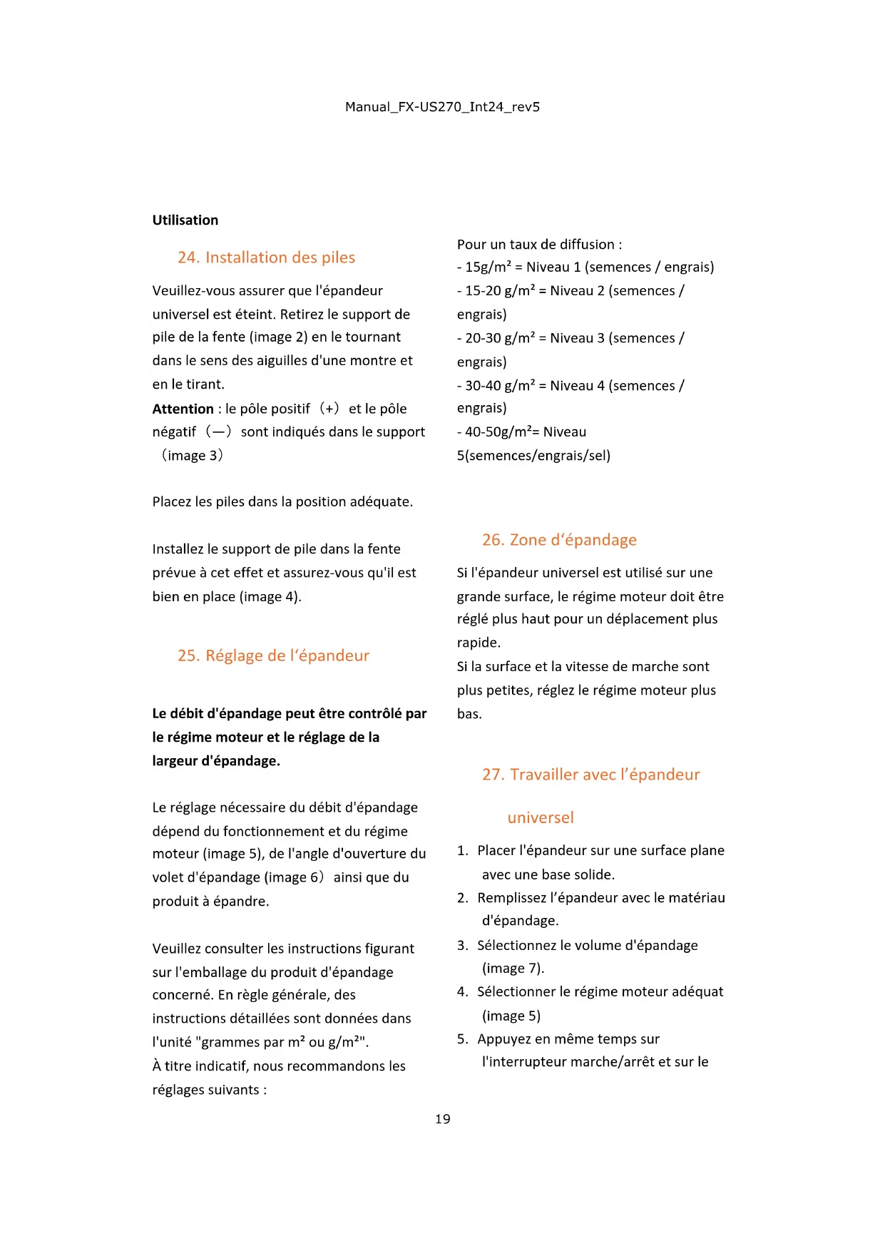De nombreux appareils sont fournis avec des piles ou des batteries rechargeables nécessaires à leur fonctionnement. Dans le cadre de la vente de ces piles ou batteries rechargeables, nous sommes tenus, en tant que distributeur, en vertu de la loi sur les piles (BattG), d'informer nos clients des éléments suivants : Les piles usagées ne doivent pas être jetées dans les ordures ménagères. Les consommateurs sont légalement tenus d'apporter Conforme aux règles de sécurité applicables Lire attentivement le manuel d’instructions Portez des vêtements adéquats. Il se peut du matériel d’épandage soit projeté Les tiers ne doivent pas se trouver dans un périmètre de 5 mètres autour de l’épandeur Le produit correspond aux spécifications Rohs Les matériaux électriques ne doivent pas être jetés dans les ordures ménagères. Veuillez vérifier où se trouvent les zones de recyclages et de rebus disponibles et autorisées localement. ATTENTION / PRUDENCE Portez des lunettes de protection et un masque avec filtre lors de l’utilisationManual_FX-US270_Int24_rev5