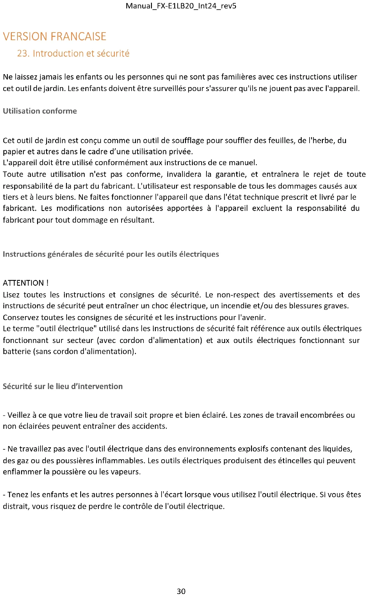Instructions générales de sécurité - Pour votre propre sécurité et celle des autres, lisez ce manuel et ses instructions de sécurité avant d'utiliser l'appareil. Veuillez conserver le mode d'emploi et les consignes de sécurité pour une utilisation ultérieure et les prendre en compte pour chaque utilisation. - Transmettez le mode d'emploi avec l'appareil en cas de changement de propriétaire. - Les personnes qui utilisent l'appareil ne doivent pas être sous l'influence de substances intoxicantes (par exemple, alcool, drogues ou médicaments). - N'utilisez l'appareil que de la manière prescrite et dans l’état technique fourni par le fabricant. Les modifications non autorisées apportées à l'appareil excluent la responsabilité du fabricant pour tout dommage en résultant. - N'utilisez l'appareil qu'à la lumière du jour ou sous un bon éclairage artificiel. - N'utilisez l'appareil que par temps sec. Tenez-le à l'abri de la pluie ou de l'humidité. L'infiltration d'eau dans l'appareil augmente le risque de choc électrique. - Éteignez l'appareil et retirez la batterie dans les conditions suivantes : ⬧ si l'appareil est laissé sans surveillance ; ⬧ avant de vérifier, de nettoyer ou d'effectuer d'autres travaux sur l'appareil ; ⬧ si l'appareil commence à vibrer excessivement. Avant l'utilisation - Familiarisez-vous avec l'appareil de soufflage, ses fonctions et ses commandes avant de commencer à travailler. - Vérifiez si l'appareil présente des signes d'usure ou des dommages avant de le mettre en marche et après un choc. - N'utilisez pas un appareil dont l'interrupteur est défectueux et qui ne peut plus être allumé ou éteint. - Vérifiez que tous les écrous, boulons et vis soient bien serrés pour assurer un fonctionnement sûr de l'appareil. - N'utilisez jamais un appareil dont certaines pièces sont endommagées ou manquantes. Faites-les réparer ou, le cas échéant, remplacer par un technicien qualifié ou un atelier spécialisé. - Lorsque vous travaillez avec ou sur l'appareil, portez toujours des chaussures robustes, des pantalons longs et un équipement de protection individuelle approprié (lunettes de protection, protection auditive, gants de travail antidérapants, etc.) Le port d'un équipement de protection individuelle réduit le risque de blessure.Manual_FX-E1LB20_Int24_rev5