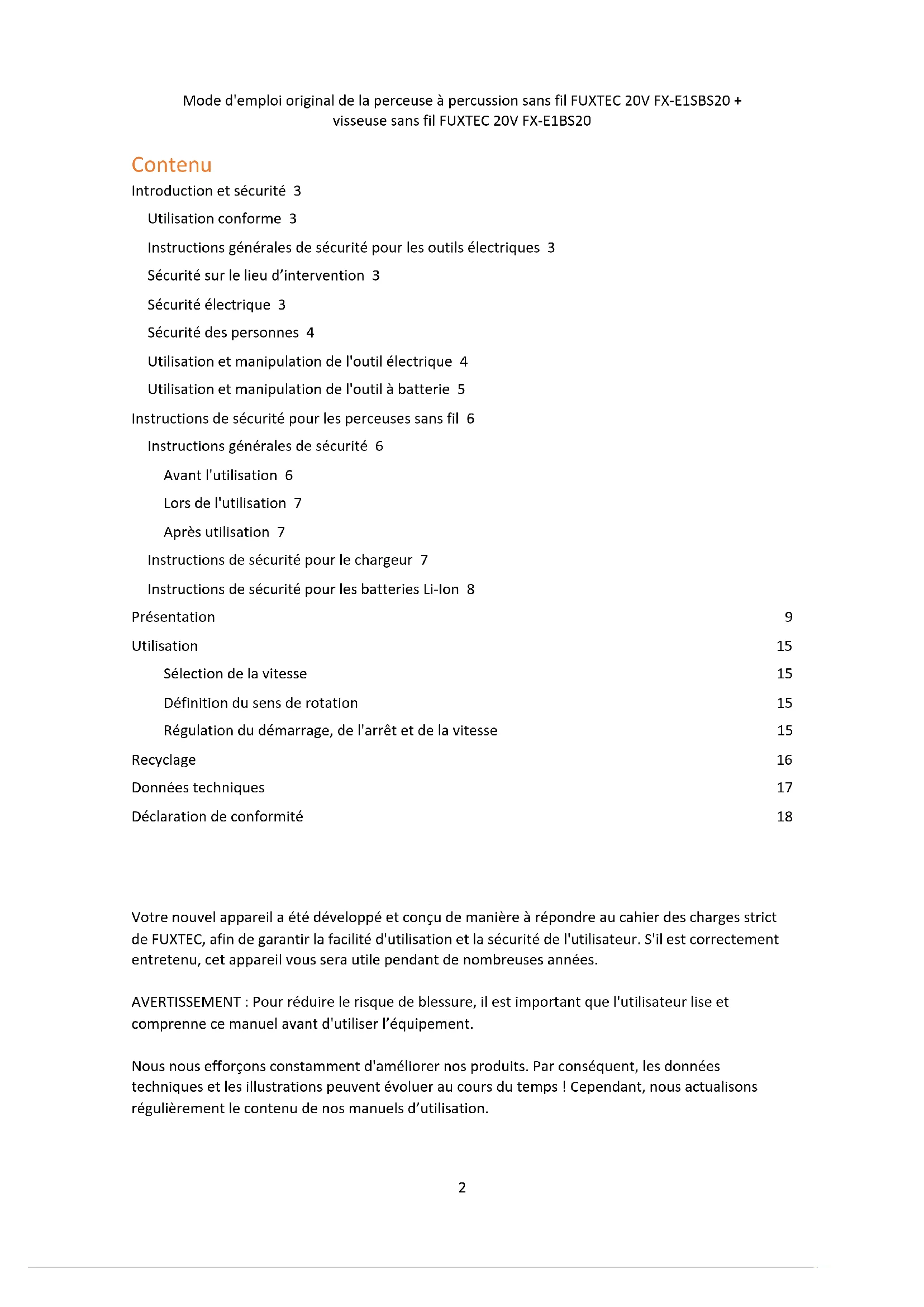 comprenne ce manuel avant d'utiliser l’équipement. Nous nous efforçons constamment d'améliorer nos produits. Par conséquent, les données techniques et les illustrations peuvent évoluer au cours du temps ! Cependant, nous actualisons régulièrement le contenu de nos manuels d’utilisation.Mode d'emploi original de la perceuse à percussion sans fil FUXTEC 20V FX-E1SBS20 + visseuse sans fil FUXTEC 20V FX-E1BS20
