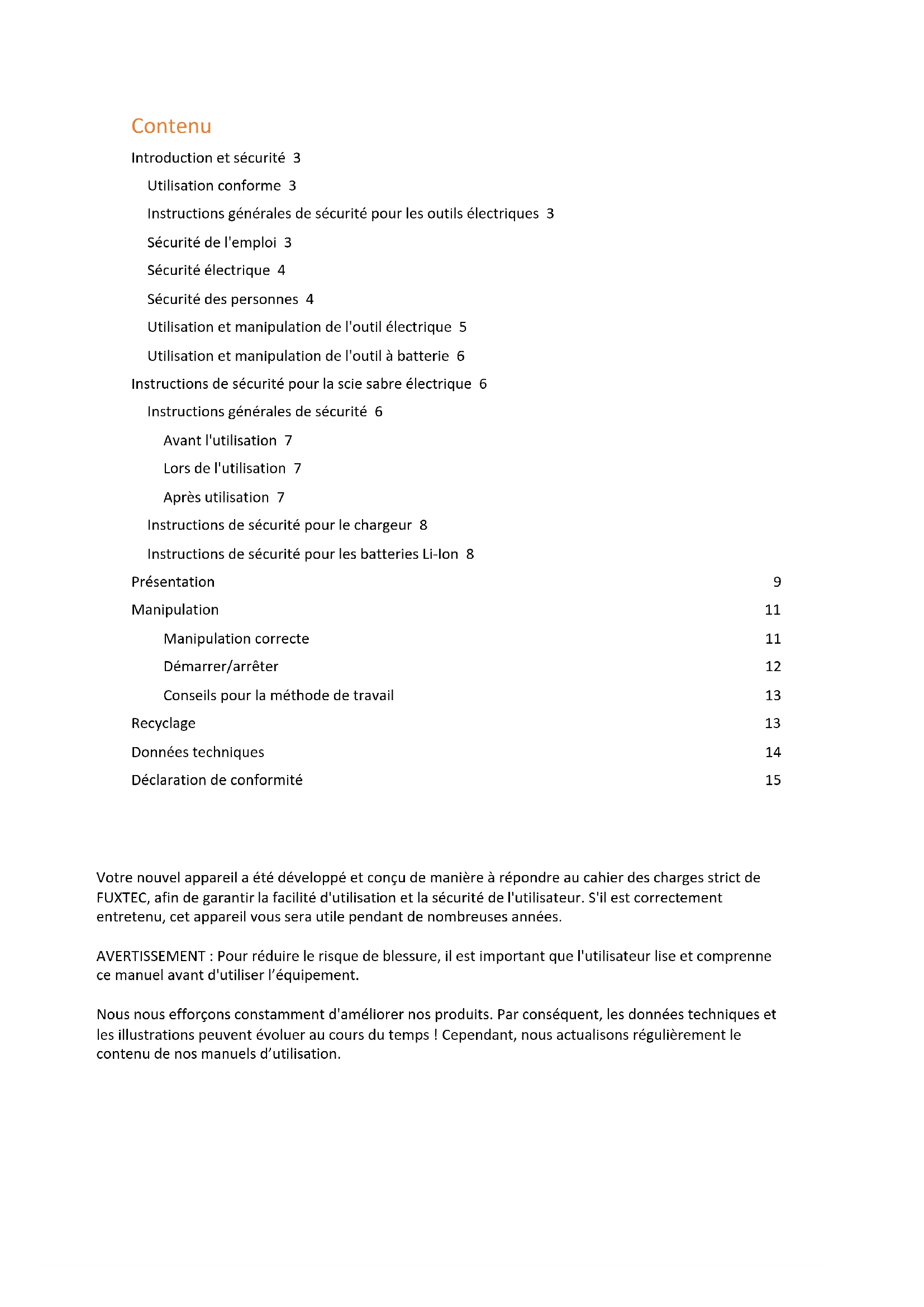 Herrenberg, 17.01.2020 Tim Gumprecht FUXTEC GmbH KAPPSTRASSE 69, 71083 HerrenbergContenu Introduction et sécurité 3 Utilisation conforme 3 Instructions générales de sécurité pour les outils électriques 3 Sécurité de l'emploi 3 Sécurité électrique 4 Sécurité des personnes 4 Utilisation et manipulation de l'outil électrique 5 Utilisation et manipulation de l'outil à batterie 6 Instructions de sécurité pour la scie sabre électrique 6 Instructions générales de sécurité 6 Avant l'utilisation 7 Lors de l'utilisation 7 Après utilisation 7 Instructions de sécurité pour le chargeur 8 Instructions de sécurité pour les batteries Li-Ion 8 Présentation 9 Manipulation 11 Manipulation correcte 11 Démarrer/arrêter 12 Conseils pour la méthode de travail 13 Recyclage 13 Données techniques 14 Déclaration de conformité 15