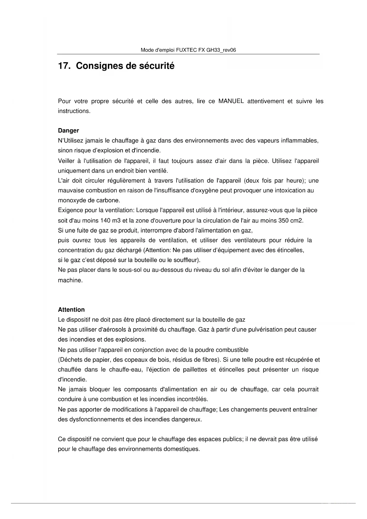 Pour votre propre sécurité et celle des autres, lire ce MANUEL attentivement et suivre les instructions. Danger N’Utilisez jamais le chauffage à gaz dans des environnements avec des vapeurs inflammables, sinon risque d’explosion et d'incendie. Veiller à l'utilisation de l'appareil, il faut toujours assez d'air dans la pièce. Utilisez l'appareil uniquement dans un endroit bien ventilé. L'air doit circuler régulièrement à travers l'utilisation de l'appareil (deux fois par heure); une mauvaise combustion en raison de l'insuffisance d'oxygène peut provoquer une intoxication au monoxyde de carbone. Exigence pour la ventilation: Lorsque l'appareil est utilisé à l'intérieur, assurez-vous que la pièce soit d'au moins 140 m3 et la zone d'ouverture pour la circulation de l'air au moins 350 cm2. Si une fuite de gaz se produit, interrompre d'abord l'alimentation en gaz, puis ouvrez tous les appareils de ventilation, et utiliser des ventilateurs pour réduire la concentration du gaz déchargé (Attention: Ne pas utiliser d’équipement avec des étincelles, si le gaz c’est déposé sur la bouteille ou le souffleur). Ne pas placer dans le sous-sol ou au-dessous du niveau du sol afin d'éviter le danger de la machine.
