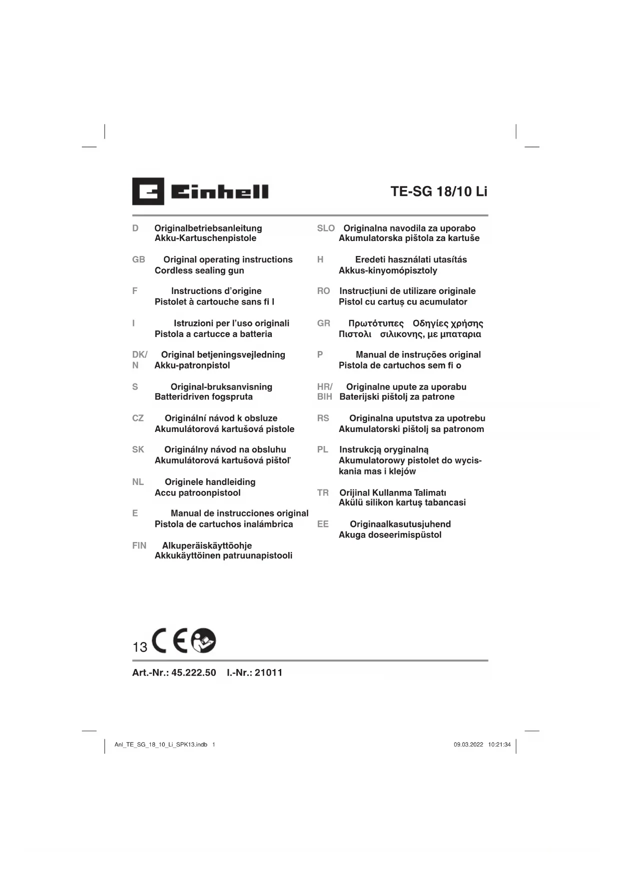 l’aff ectation Le pistolet à cartouche sans fi l convient pour éjecter et appliquer des mastics ou des adhésifs, par ex. silicone, acrylique et colle. La machine doit exclusivement être employée conformément à son aff ectation. Chaque uti- lisation allant au-delà de cette aff ectation est considérée comme non conforme. Pour les dommages en résultant ou les blessures de tout genre, le producteur décline toute responsabilité et l’opérateur/l’exploitant est responsable. Anl_TE_SG_18_10_Li_SPK13.indb 25 09.03.2022 10:22:09F