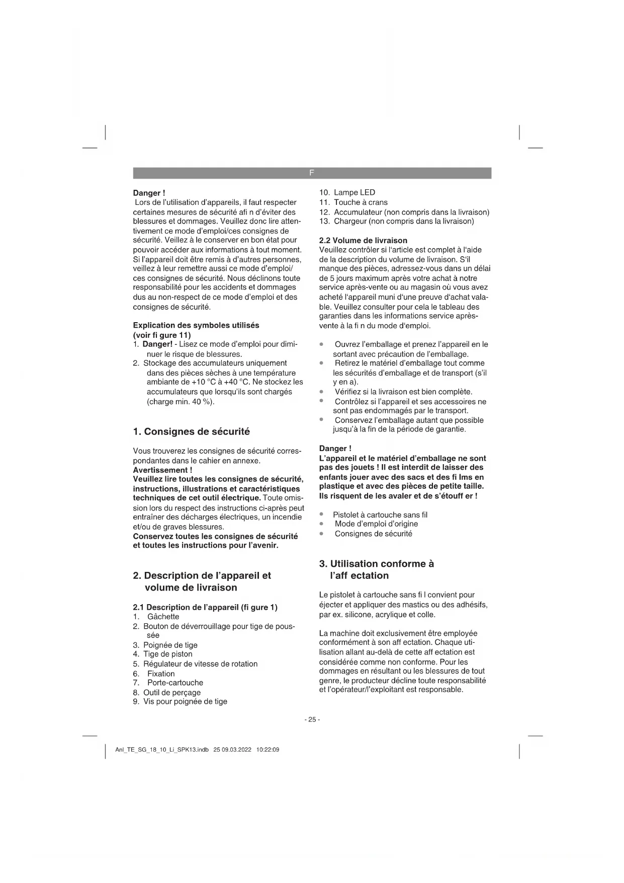 l’aff ectation Le pistolet à cartouche sans fi l convient pour éjecter et appliquer des mastics ou des adhésifs, par ex. silicone, acrylique et colle. La machine doit exclusivement être employée conformément à son aff ectation. Chaque uti- lisation allant au-delà de cette aff ectation est considérée comme non conforme. Pour les dommages en résultant ou les blessures de tout genre, le producteur décline toute responsabilité et l’opérateur/l’exploitant est responsable. Anl_TE_SG_18_10_Li_SPK13.indb 25 09.03.2022 10:22:09F