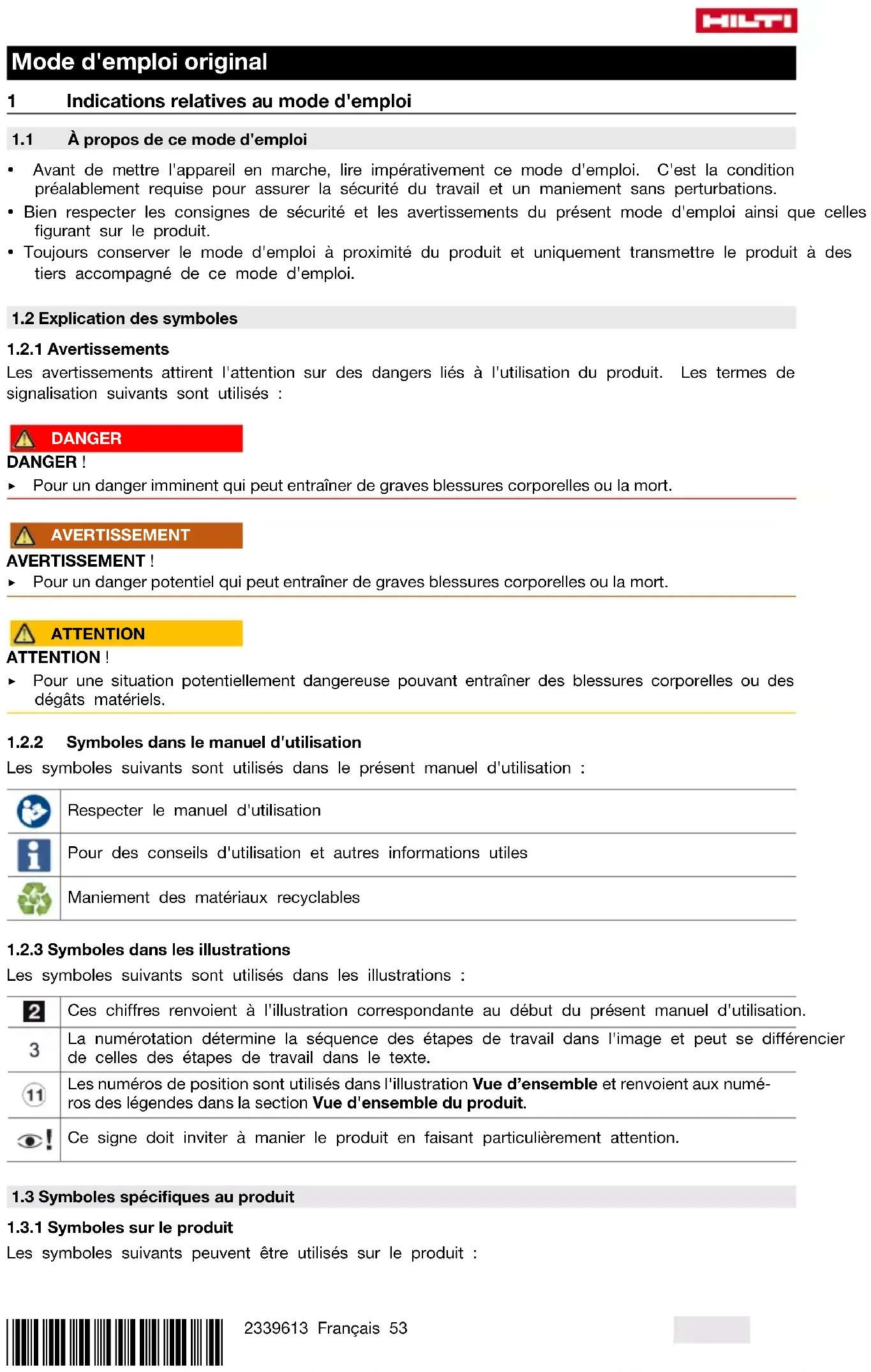 Le fabricant déclare sous sa seule et unique responsabilité que le produit décrit ici est conforme aux directives et normes en vigueur. Une copie de la Déclaration de conformité se trouve en fin de la présente documentation. Pour obtenir les documentations techniques, s'adresser à : Hilti Entwicklungsgesellschaft mbH | Zulassung Geräte | Hiltistraße 6 | 86916 Kaufering, DE 2 Sécurité