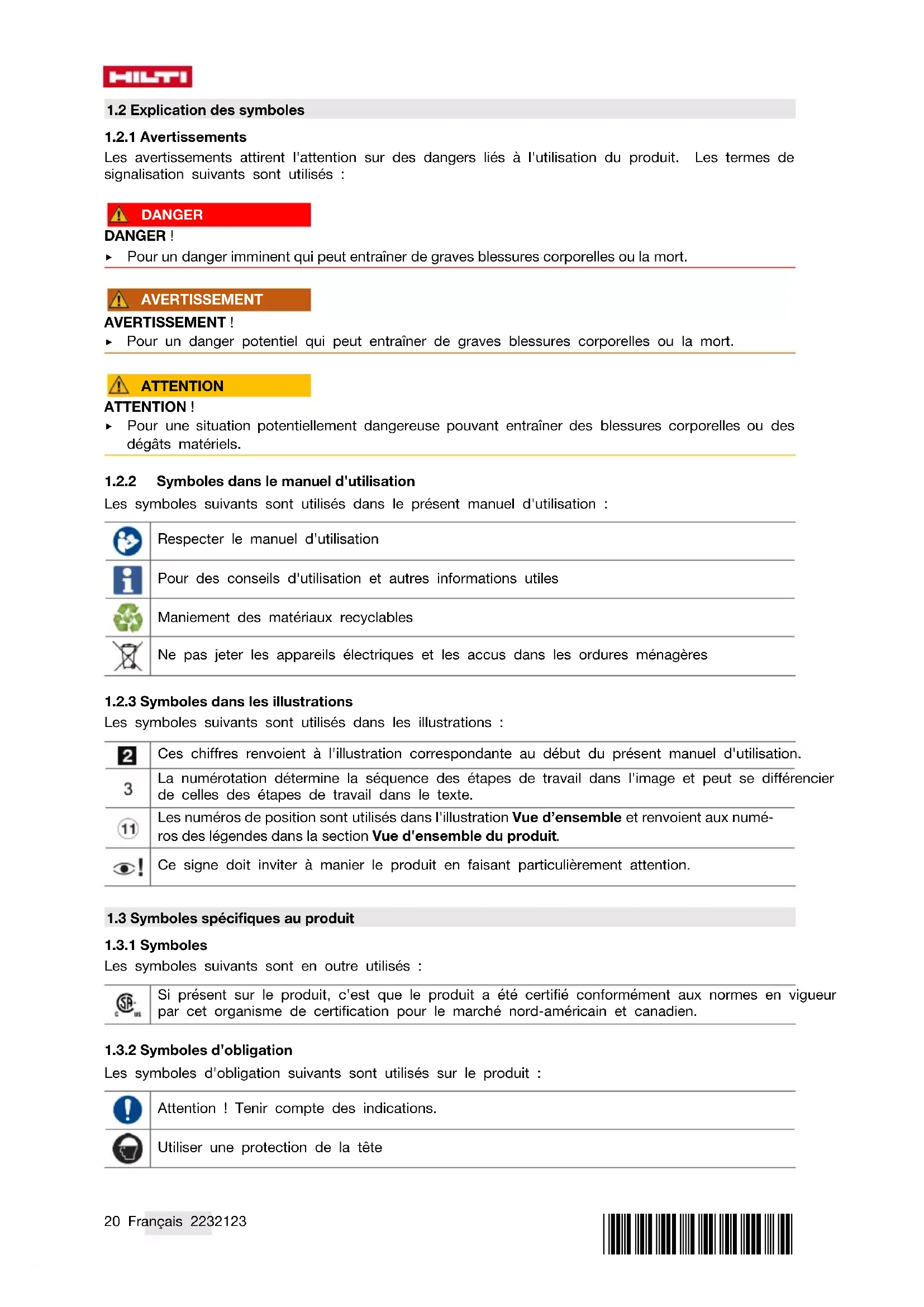 Consignes de sécurité fondamentales AVERTISSEMENT ! Lire et comprendre toutes les consignes de sécurité et instructions. Tout manquement au respect des consignes de sécurité et instructions peut entraîner de graves blessures sur les personnes. Les consignes de sécurité et instructions doivent être intégralement conservées pour les utilisations futures. ▶ N'entreprendre aucune manipulation ni modification sur le cloueur. ▶ Toujours utiliser des cloueurs, éléments d'équipement (plaques de base, canons, chargeurs, pistons et accessoires) et consommables (éléments de fixation et cartouches) adaptés les uns aux autres. ▶ Vérifier que le cloueur et l'accessoire ne présentent pas d'éventuels dommages. ▶ Les pièces mobiles doivent fonctionner parfaitement et ne doivent pas coincer. Tenir compte des instructions relatives au nettoyage et à la lubrification données dans ce mode d'emploi → Page 33. ▶ Toutes les pièces doivent être correctement montées pour garantir un fonctionnement impeccable du cloueur. Les pièces endommagées doivent être réparées ou remplacées de manière professionnelle par le S.A.V. Hilti, sauf indication contraire dans le mode d'emploi. ▶ Utiliser uniquement les cartouches Hilti DX ou d'autres cartouches appropriées qui satisfont aux exigences de sécurité minimales. → Page 2622 Français 2232123 *2232123* ▶ Utiliser le cloueur uniquement pour les applications définies dans l'Utilisation conforme aux prescriptions