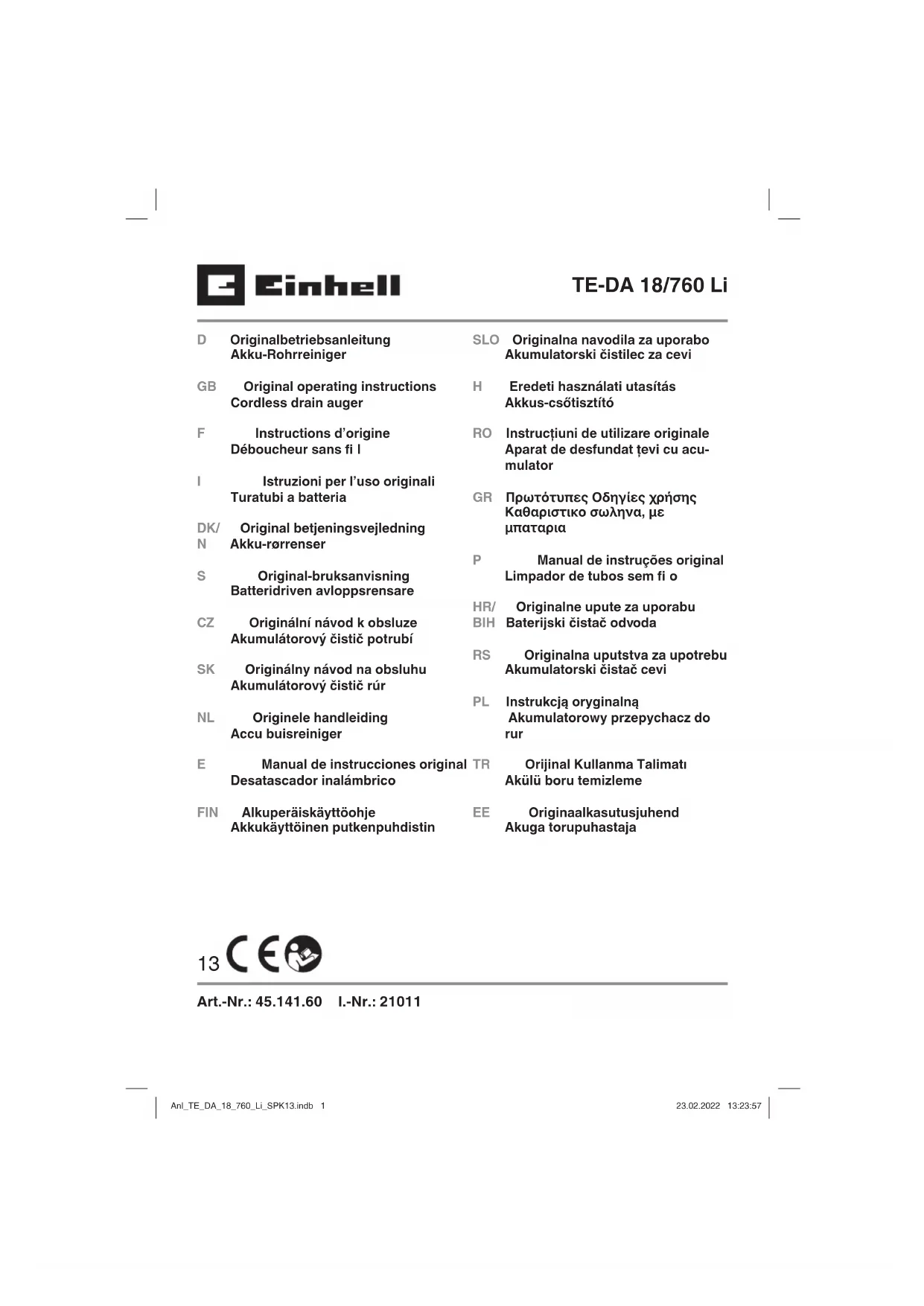 No. de pièce de rechange de la pièce requise Vous trouverez les prix et informations actuelles à l’adresse www.Einhell-Service.com Anl_TE_DA_18_760_Li_SPK13.indb 28Anl_TE_DA_18_760_Li_SPK13.indb 28 23.02.2022 13:24:1823.02.2022 13:24:18F