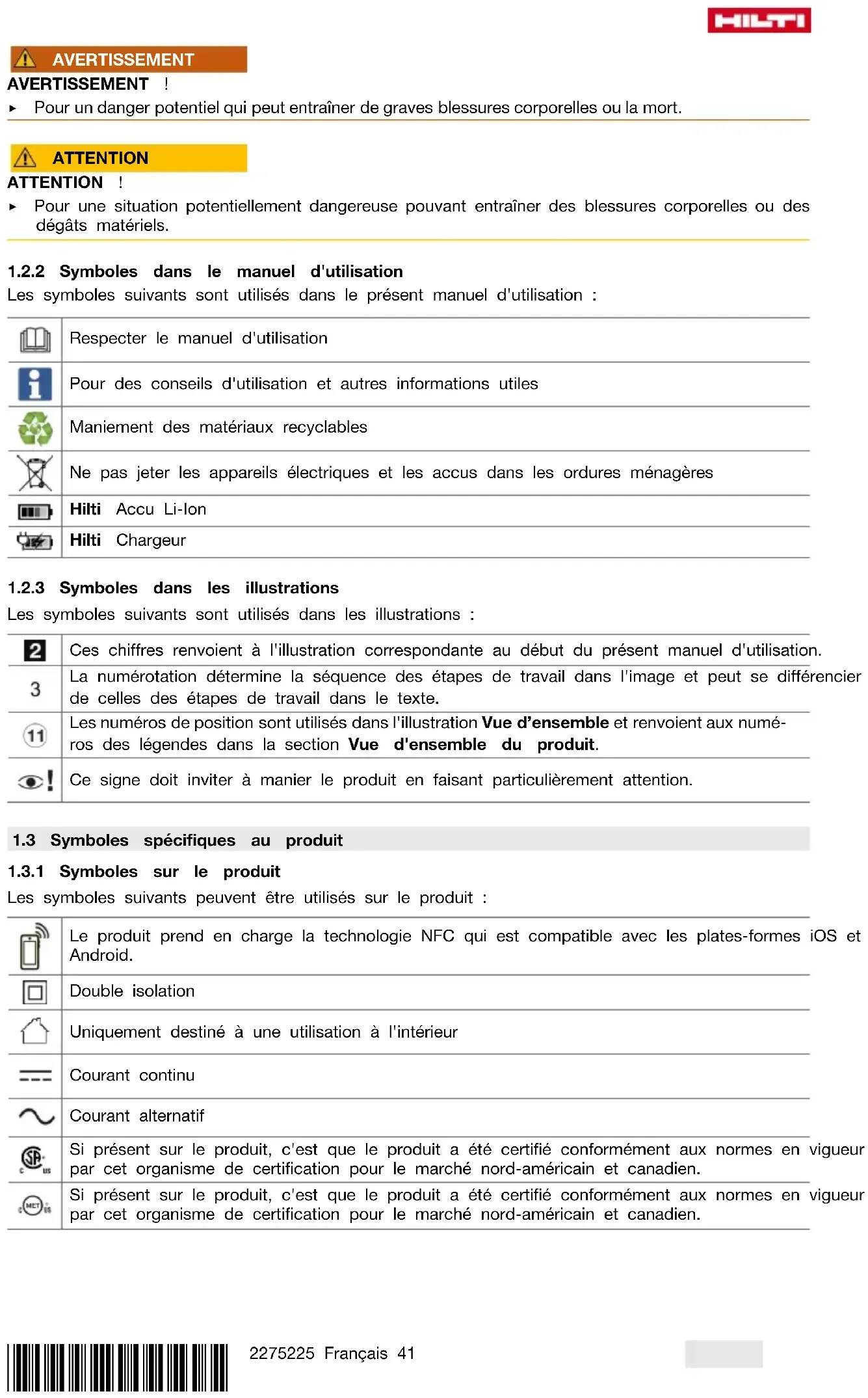 Les symboles suivants sont utilisés dans le présent manuel d'utilisation : Respecter le manuel d'utilisation Pour des conseils d'utilisation et autres informations utiles Maniement des matériaux recyclables Ne pas jeter les appareils électriques et les accus dans les ordures ménagères Hilti Accu Li-Ion Hilti Chargeur