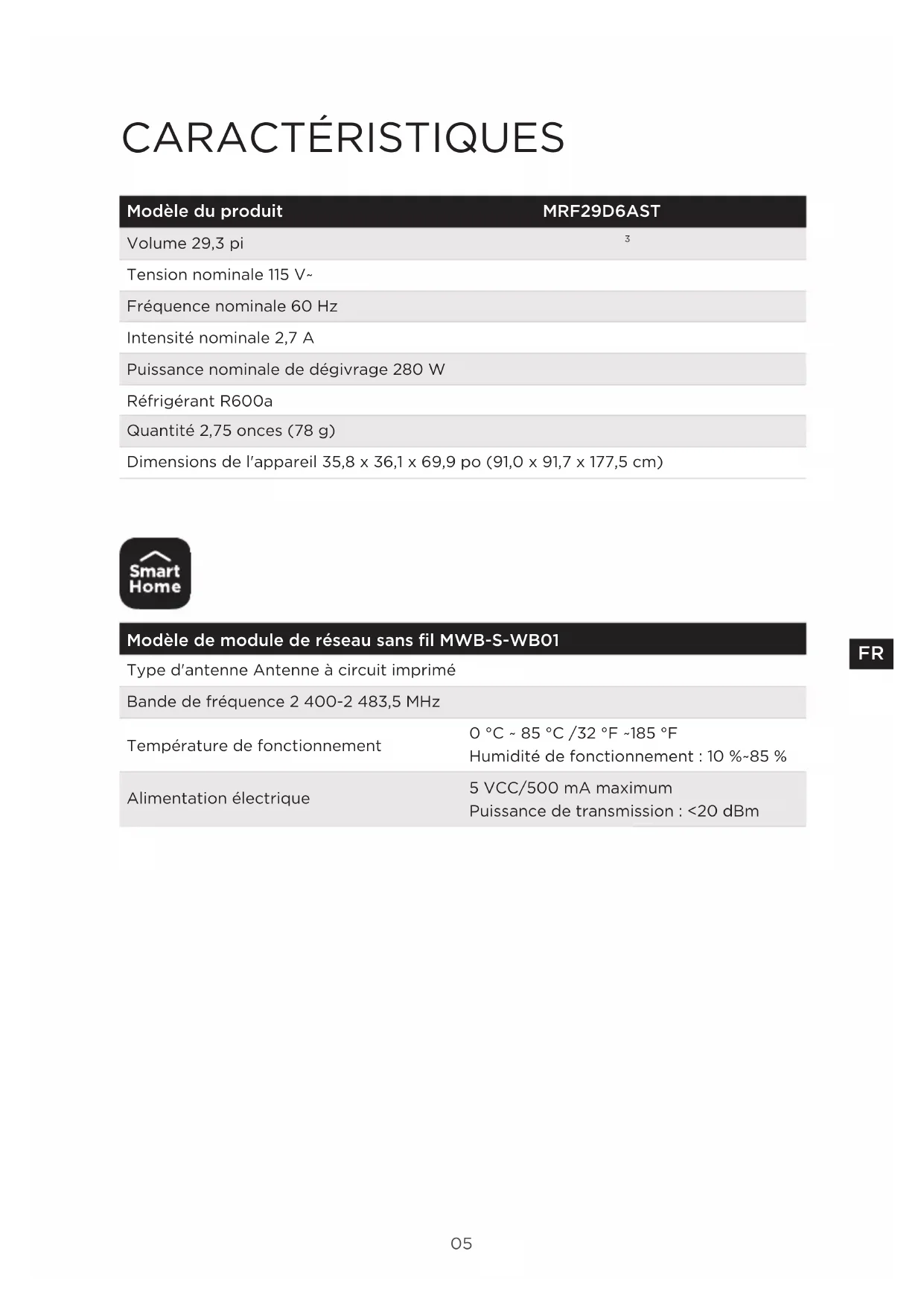 Tension nominale 115 V~ Fréquence nominale 60 Hz Intensité nominale 2,7 A Puissance nominale de dégivrage 280 W Réfrigérant R600a Quantité 2,75 onces (78 g) Dimensions de l'appareil 35,8 x 36,1 x 69,9 po (91,0 x 91,7 x 177,5 cm) Modèle de module de réseau sans fil MWB-S-WB01 Type d'antenne Antenne à circuit imprimé Bande de fréquence 2 400-2 483,5 MHz Température de fonctionnement 0 °C ~ 85 °C /32 °F ~185 °F Humidité de fonctionnement : 10 %~85 % Alimentation électrique 5 VCC/500 mA maximum Puissance de transmission : <20 dBm06
